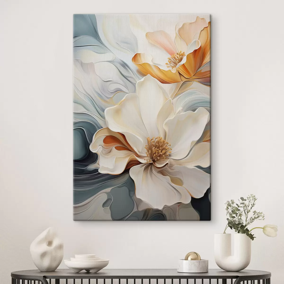 Картина Абстрактна велика квітка з білими, помаранчевими та блакитними пелюстками, фактурний фон Арт. s47878