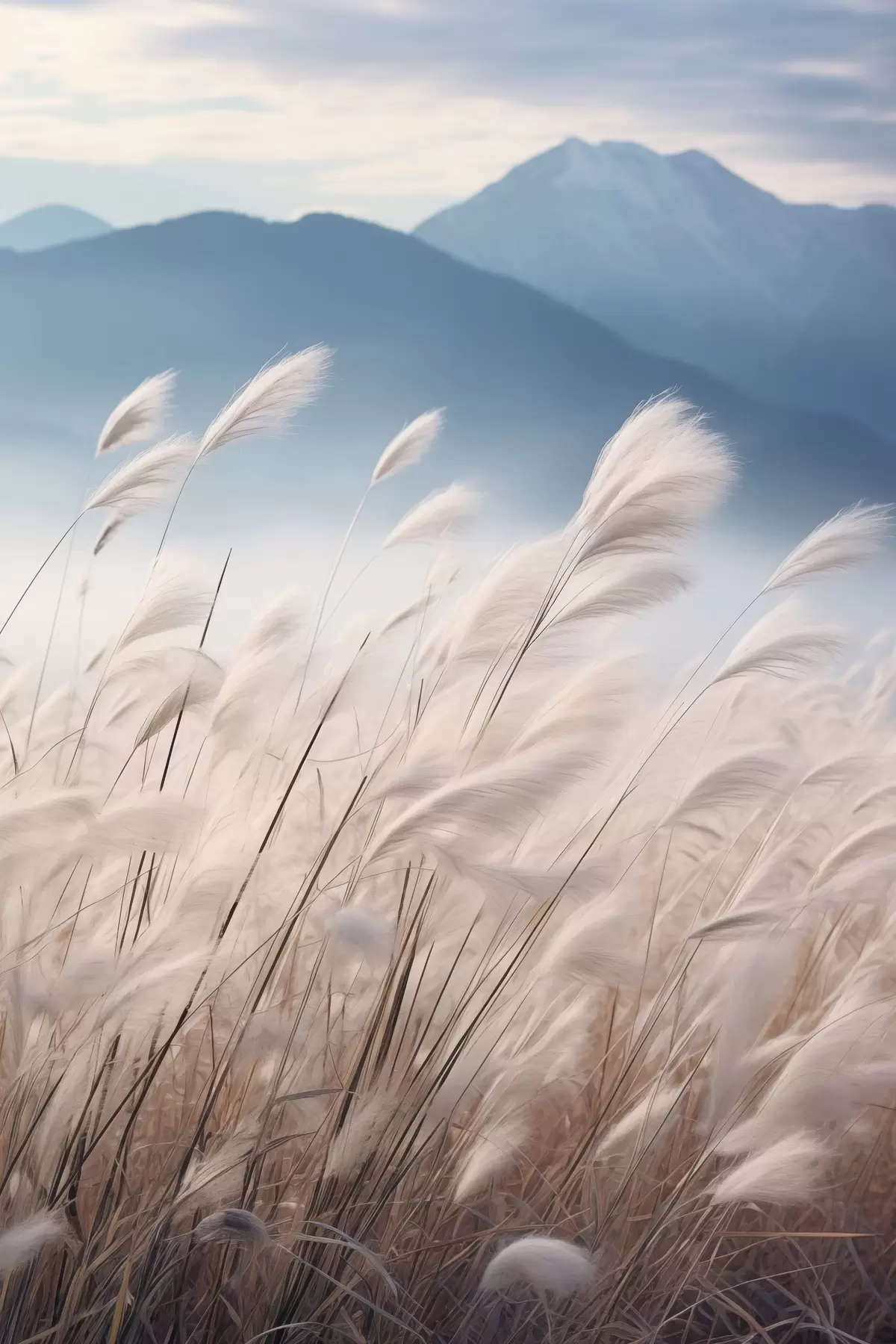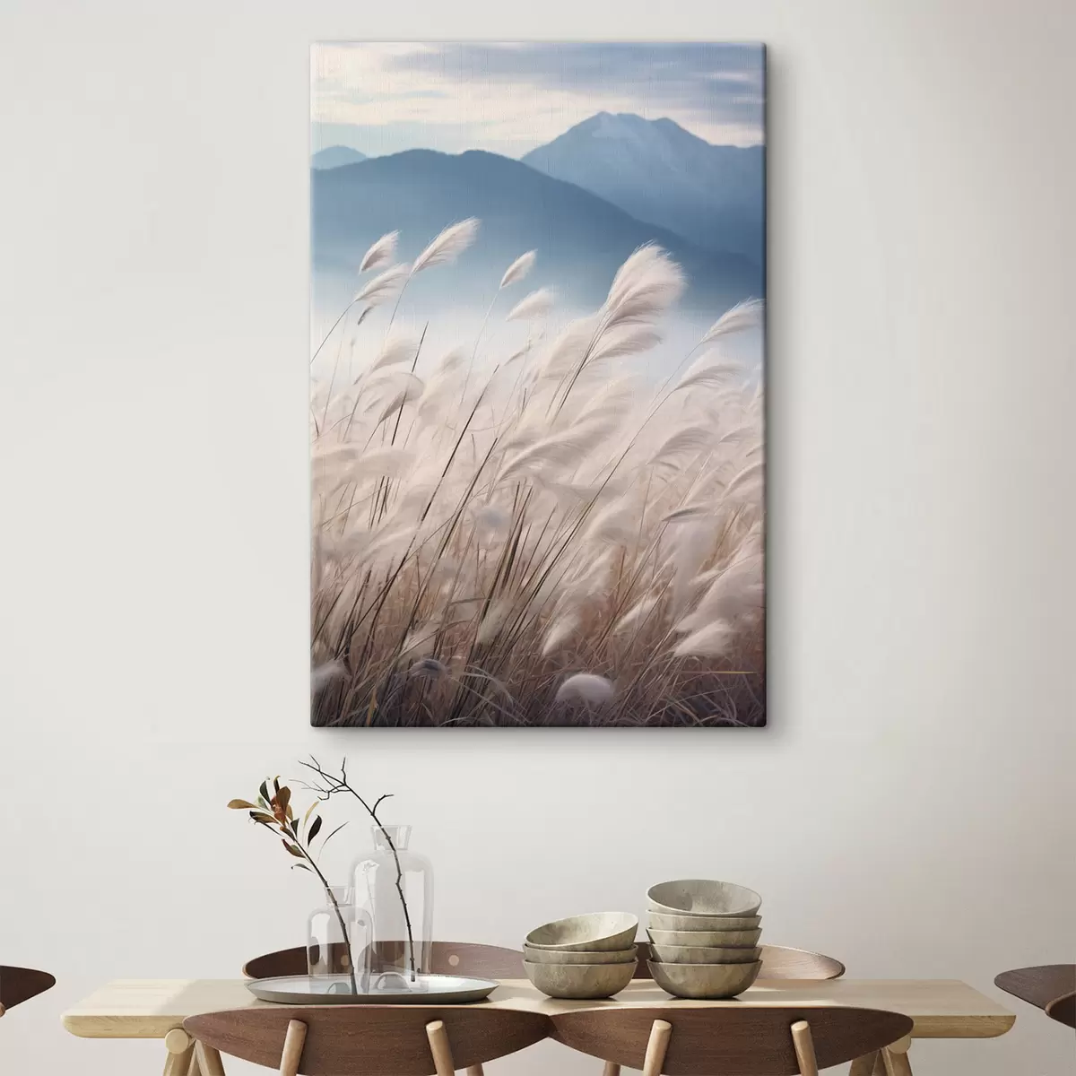 Картина Висока біла трава пампасу, що колишеться на вітрі, на тлі м'яких блакитних гір Арт. s47879