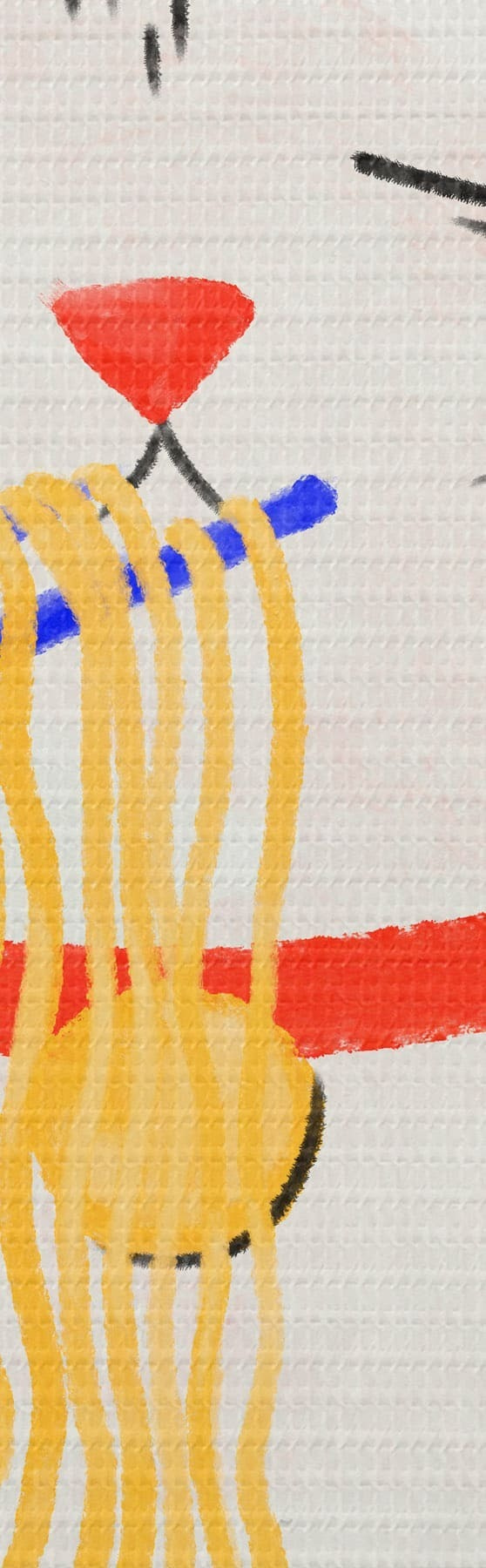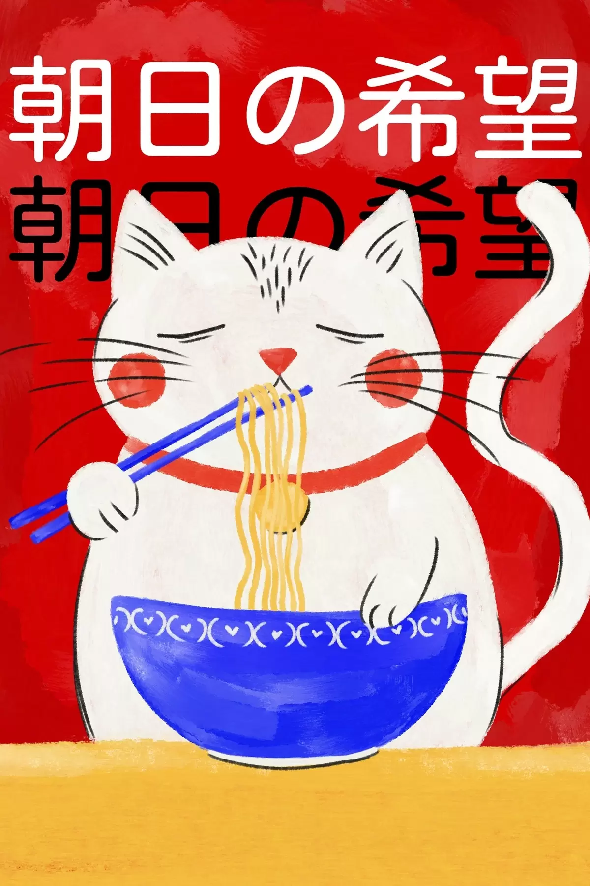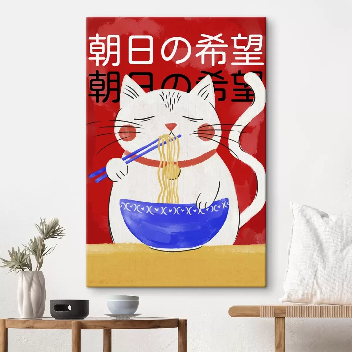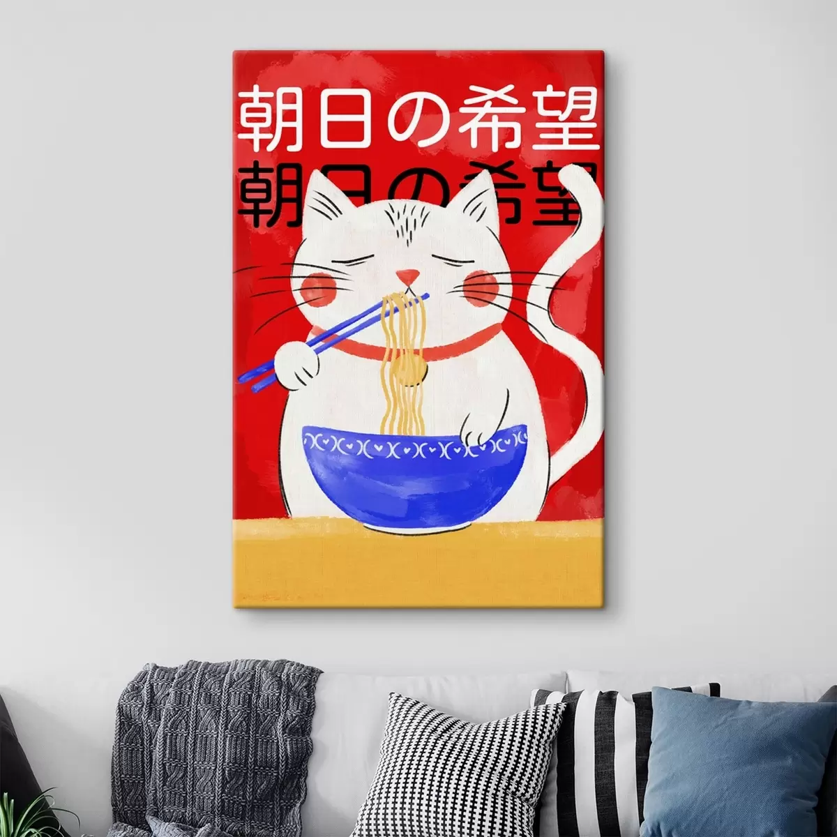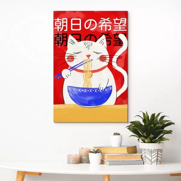 Картина Ілюстрація, на якій кіт їсть локшину на червоному тлі s48031