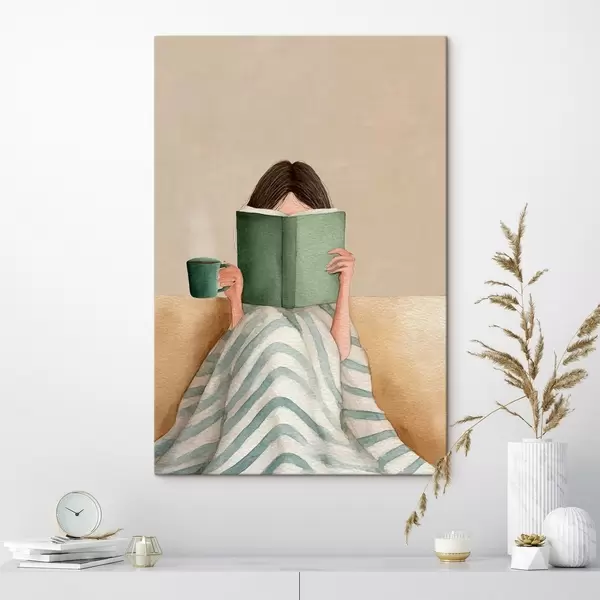 Картина м'яка акварельна ілюстрація жінки, яка сидить на дивані і читає книгу Арт. s48114
