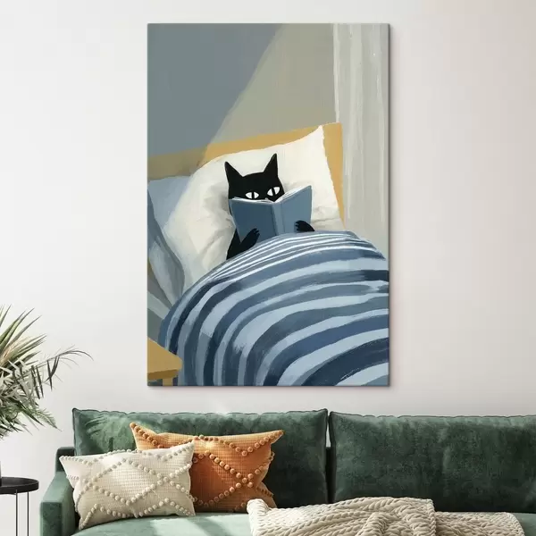 Картина мінімалістична плоска ілюстрація чорної кішки, яка читає книгу в ліжку Арт. s48117