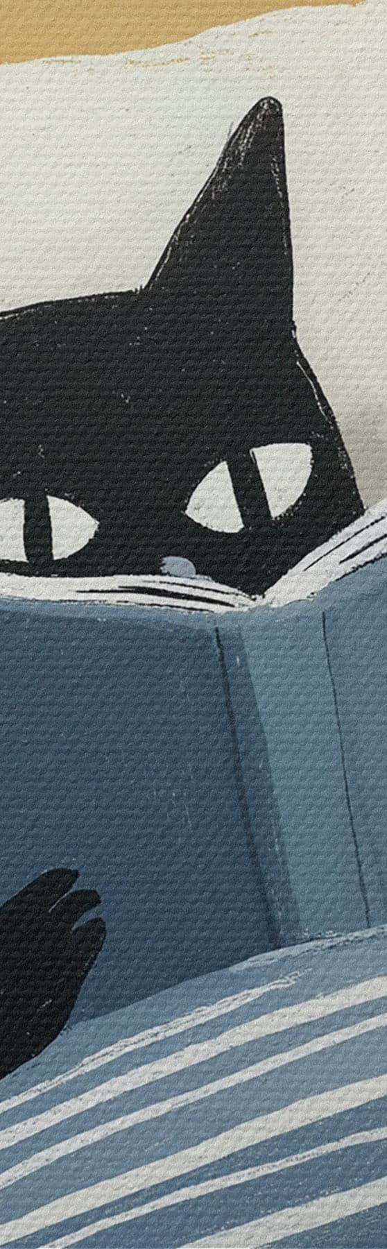 Картина мінімалістична плоска ілюстрація чорної кішки, яка читає книгу в ліжку s48117
