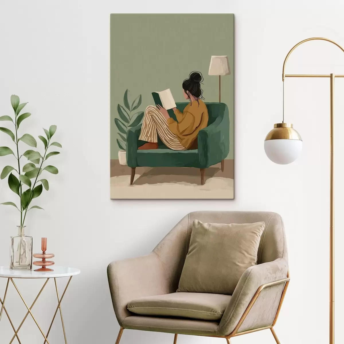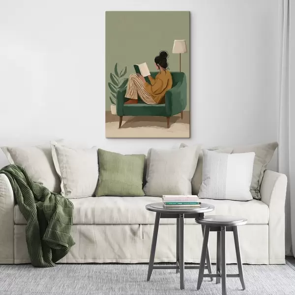 Картина мінімалістична затишна ілюстрація жінки, яка сидить у кріслі і читає Арт. s48118