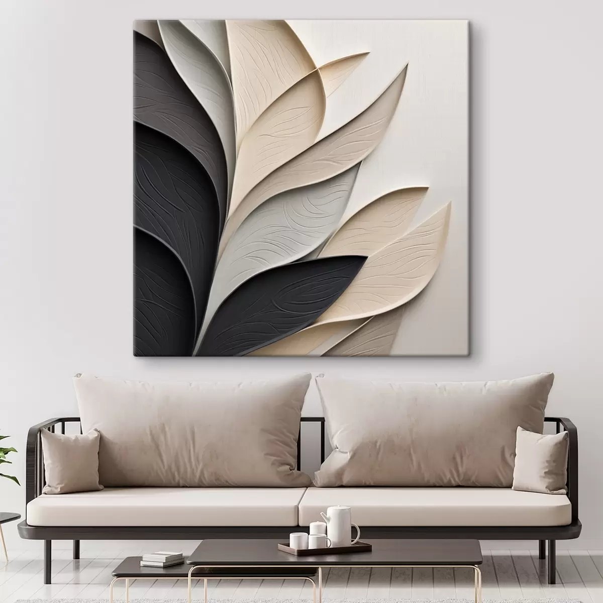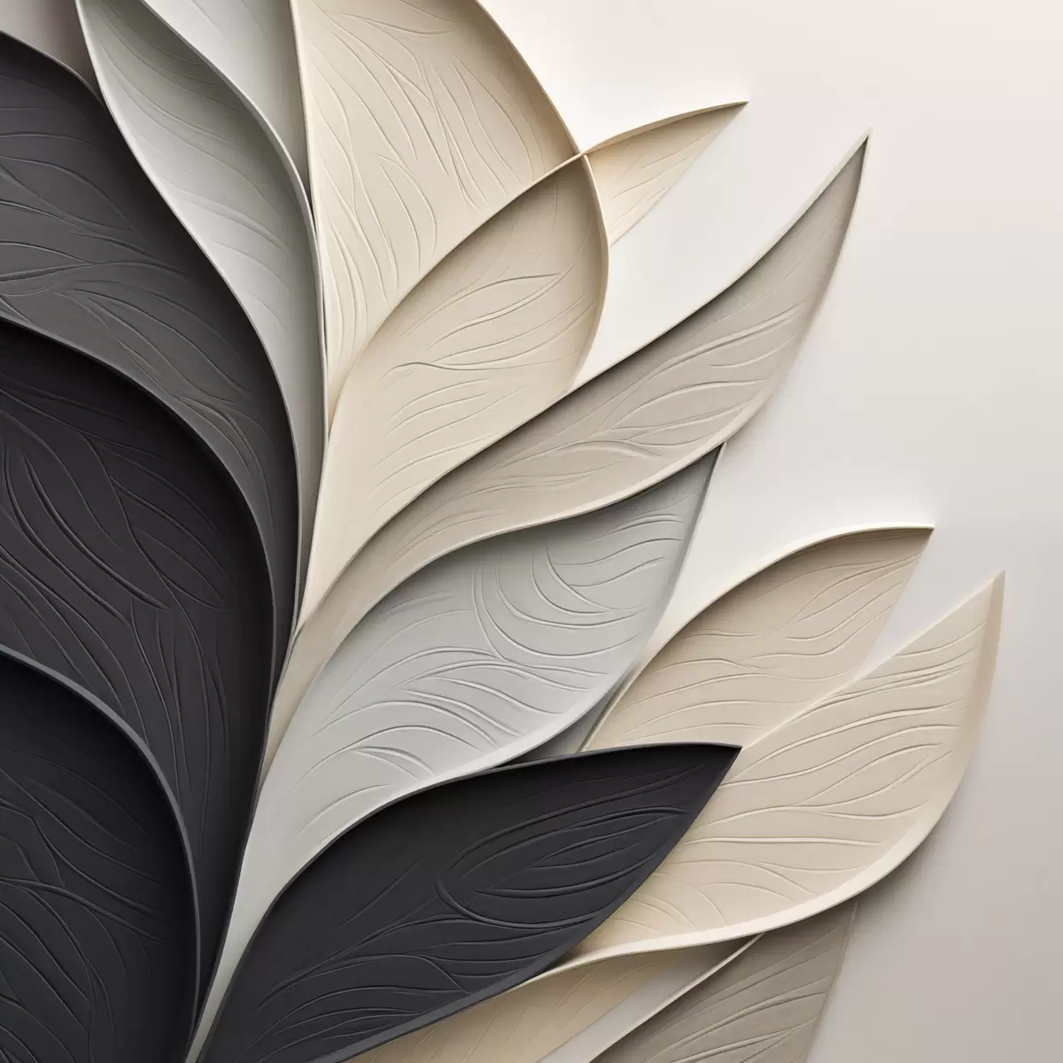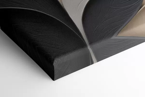 Картина Абстрактна композиція з багатошарового листя, вигнутих форм у чорному, білому та бежевому кольорах, фактурне мистецтво Арт. s48382