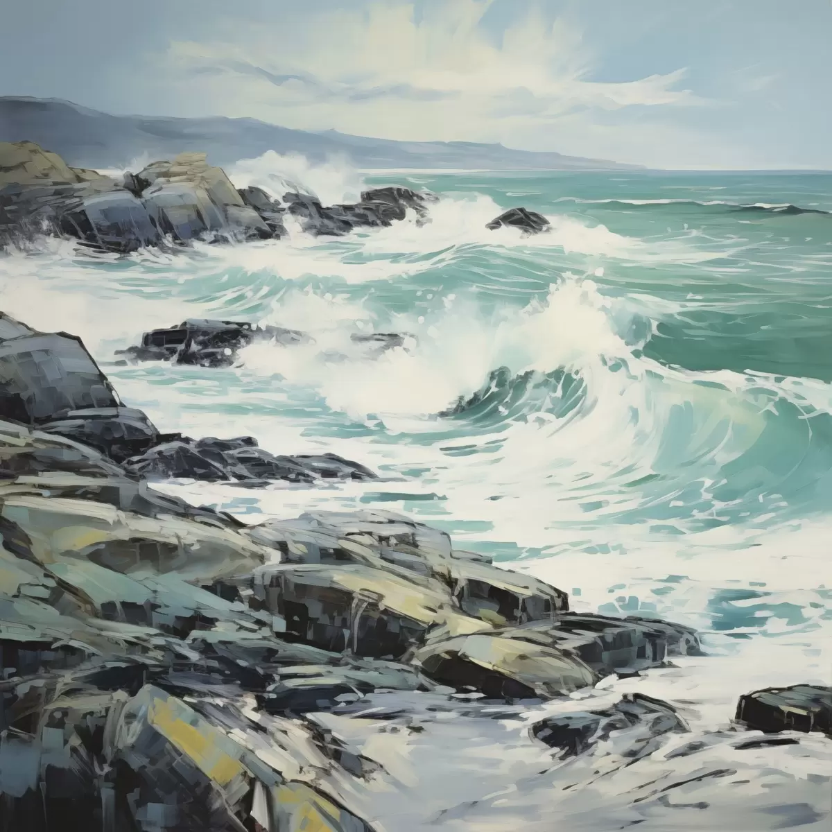 Картина Пейзаж скелястого узбережжя з хвилями під хмарним небом, у стилі живопису s48388