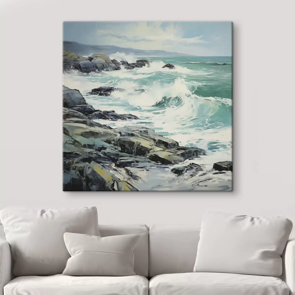 Картина Пейзаж скелястого узбережжя з хвилями під хмарним небом, у стилі живопису Арт. s48388