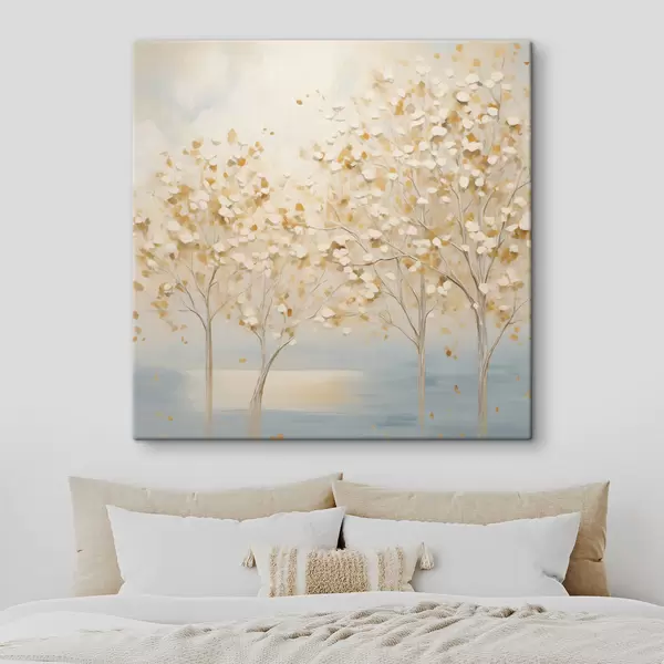 Картина Картина у фактурному стилі, на якій зображені дерева з білим та жовтим листям на світло-блакитному тлі Арт. s48392