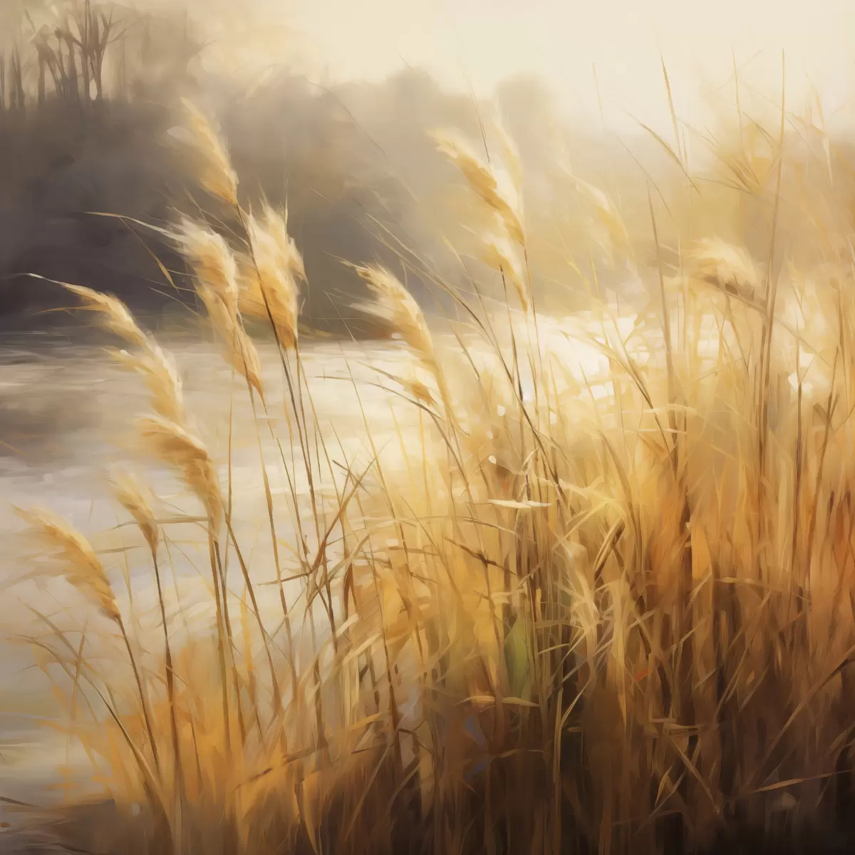 Картина На передньому плані — висока суха трава з колосками, а на задньому — озеро та дерева s48394