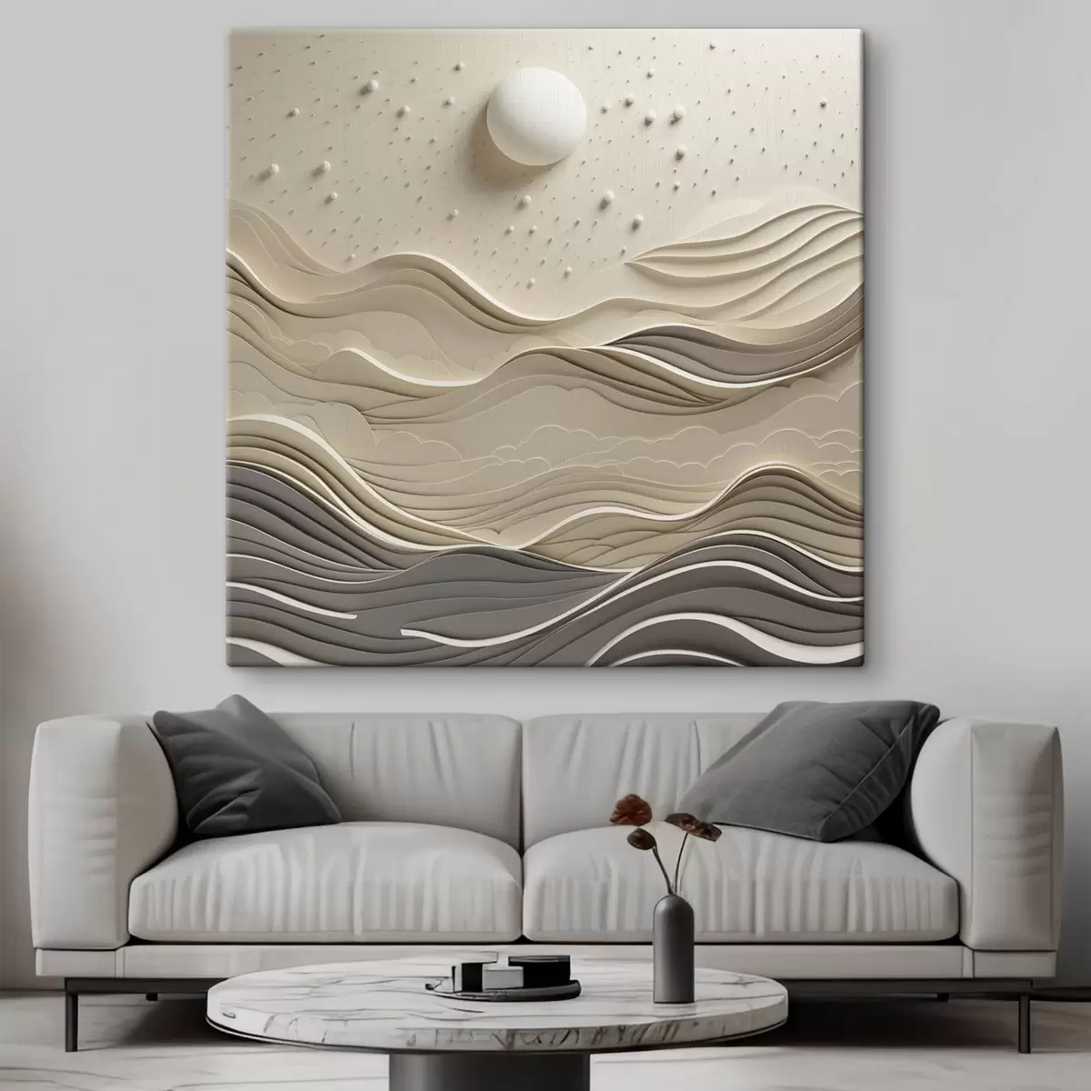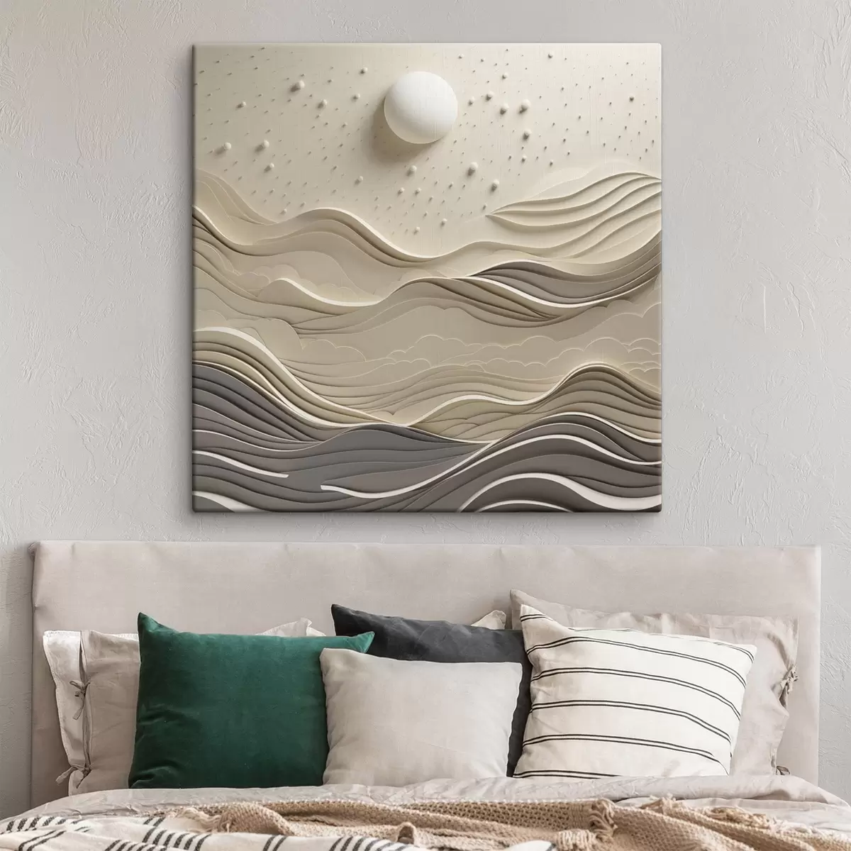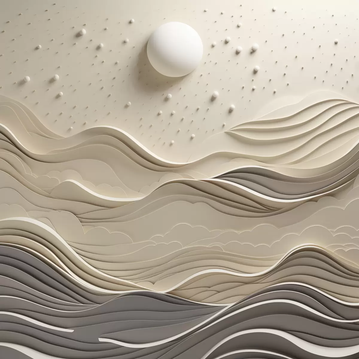 Картина Мінімалістичний стилізований пейзаж із хвилястими пагорбами та великим місяцем на зоряному небі, абстрактне мистецтво s48402