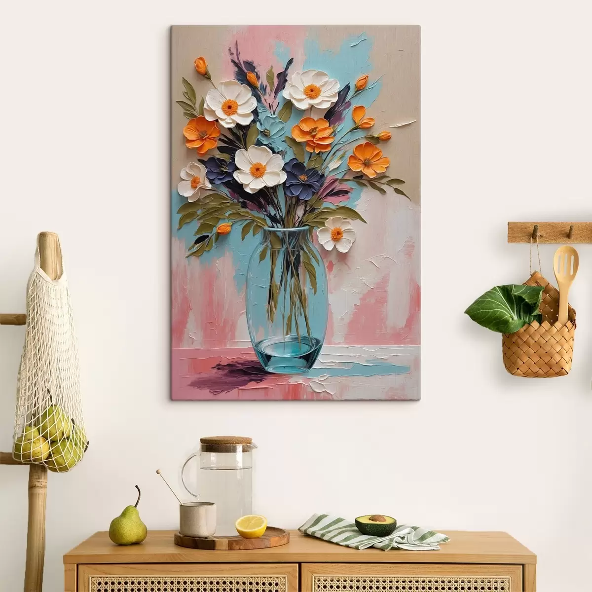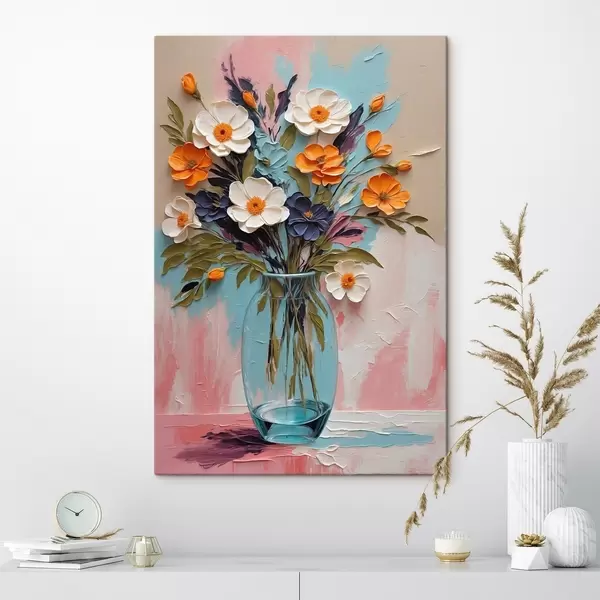 Картина Букет квітів у скляній вазі на барвистому тлі s48488