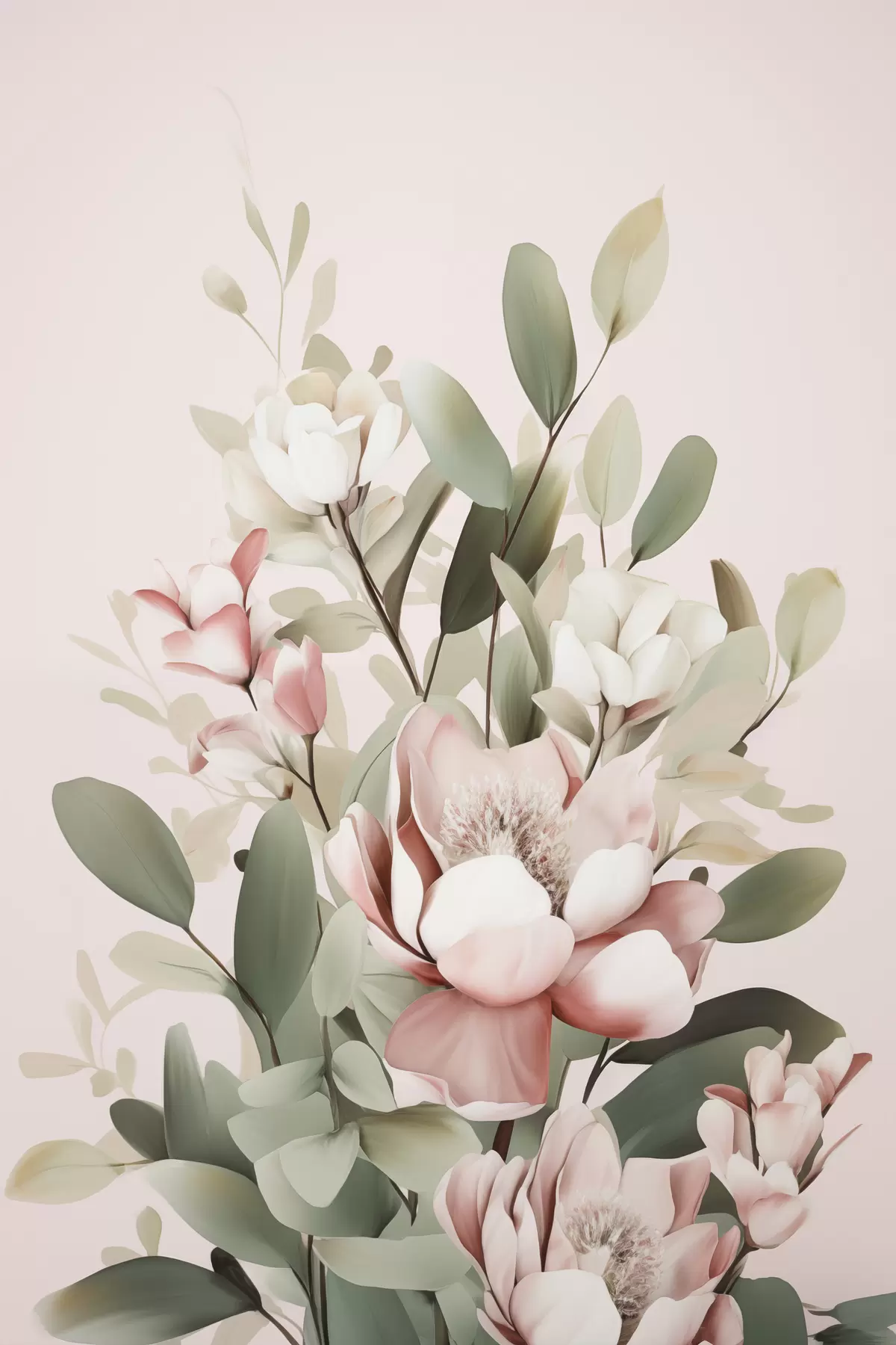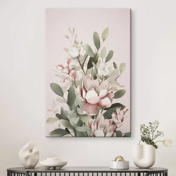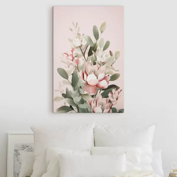 Картина Букет пастельних квітів з листям евкаліпта на блідо-рожевому тлі Арт. s48727
