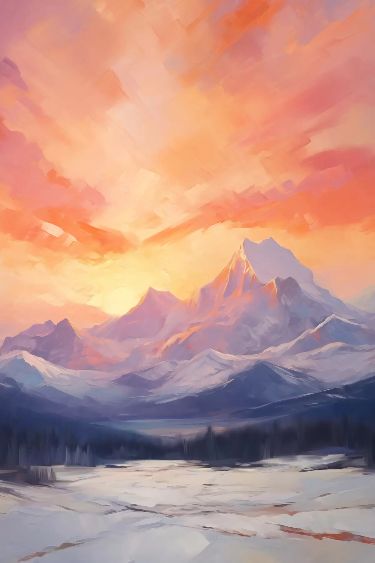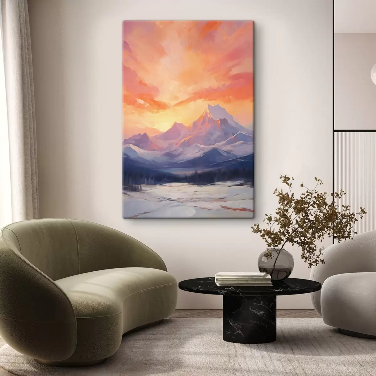 Картина Засніжені гори під яскраво-помаранчевим і рожевим небом з хмарами Арт. s48741