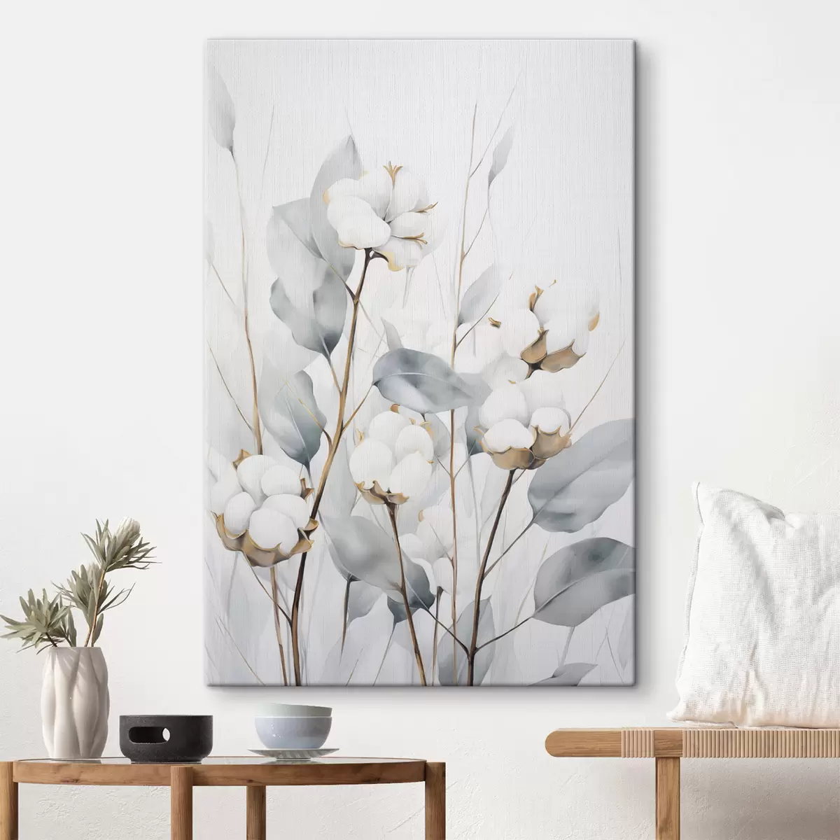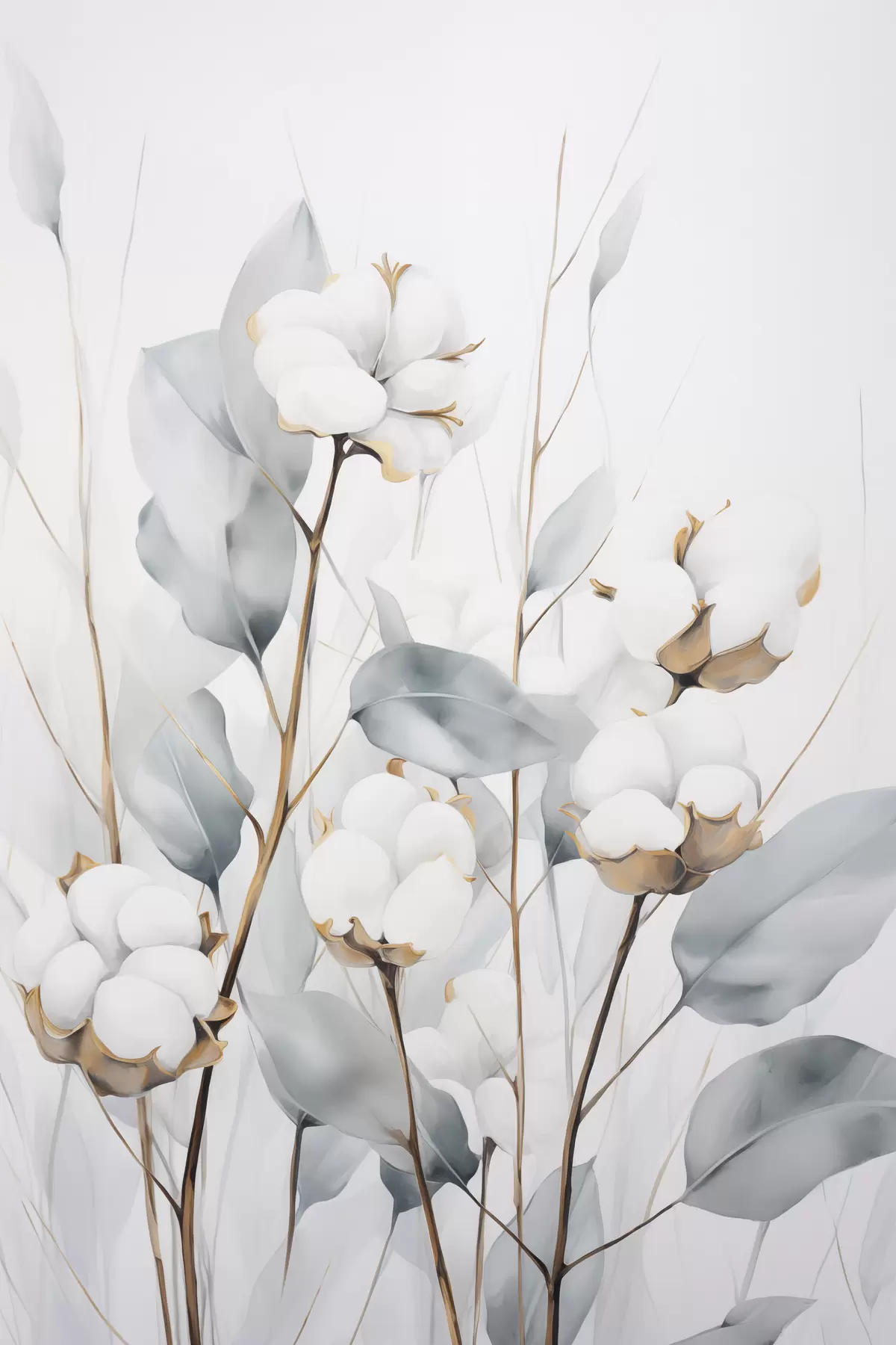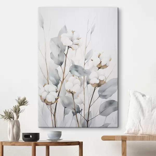Картина Біла бавовняна рослина з блідо-синьо-зеленим листям на світлому тлі Арт. s48743