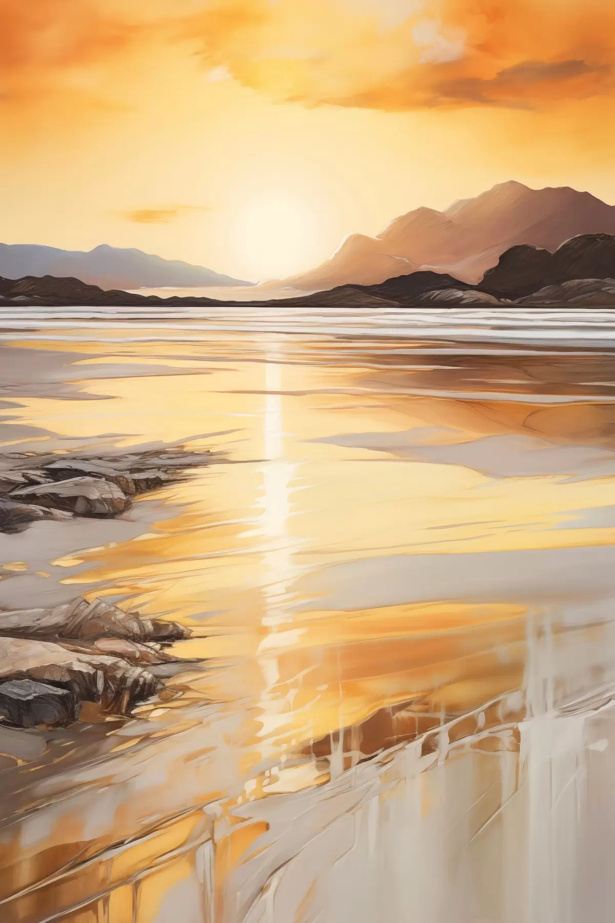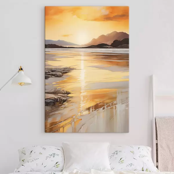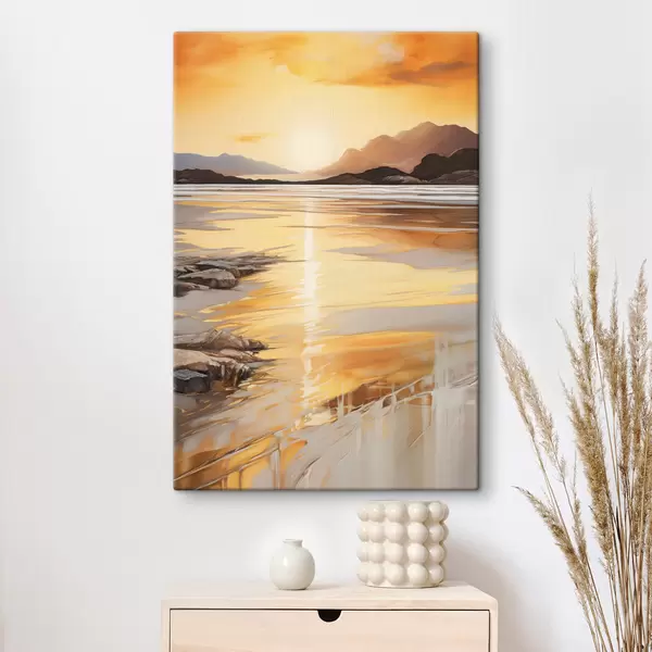 Картина Пейзаж із річкою та горами під теплим помаранчевим небом, захід сонця Арт. s48756