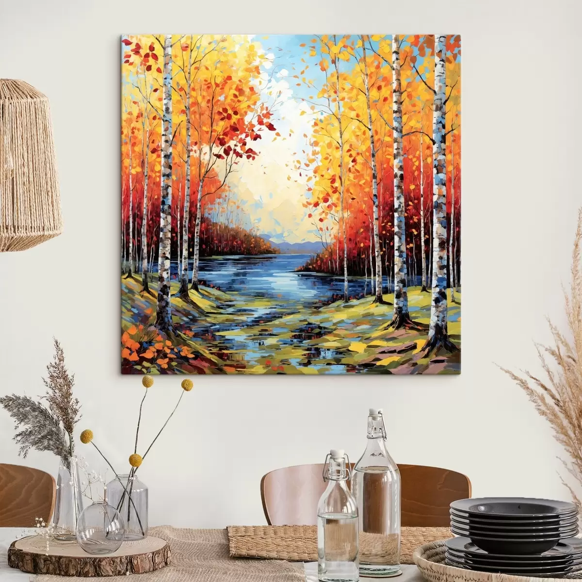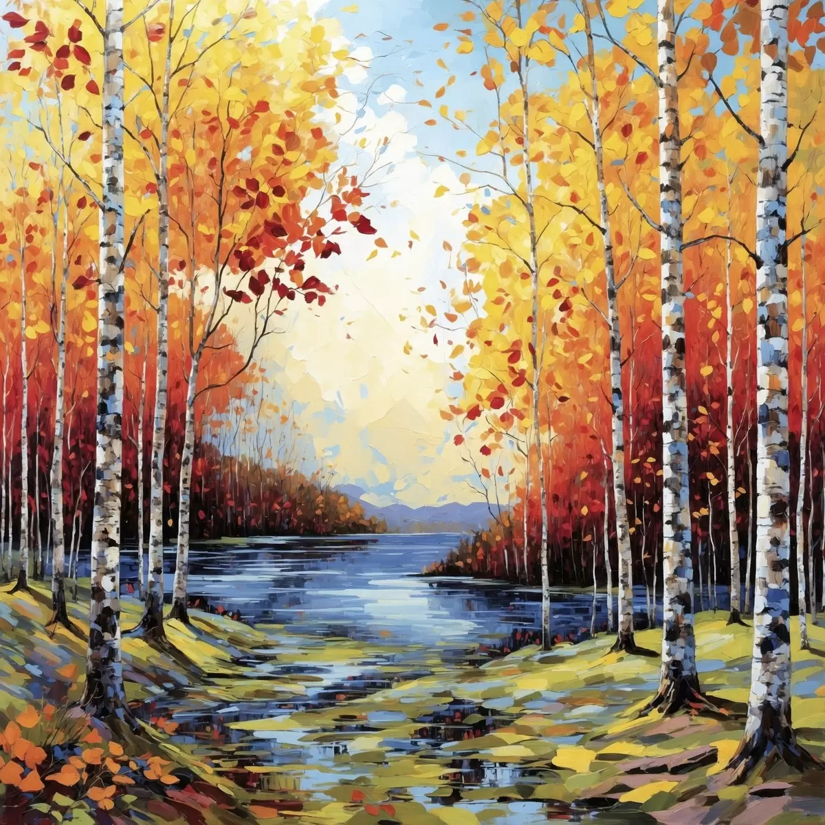 Картина Імпресіонізм: осінній березовий ліс із річкою s48809