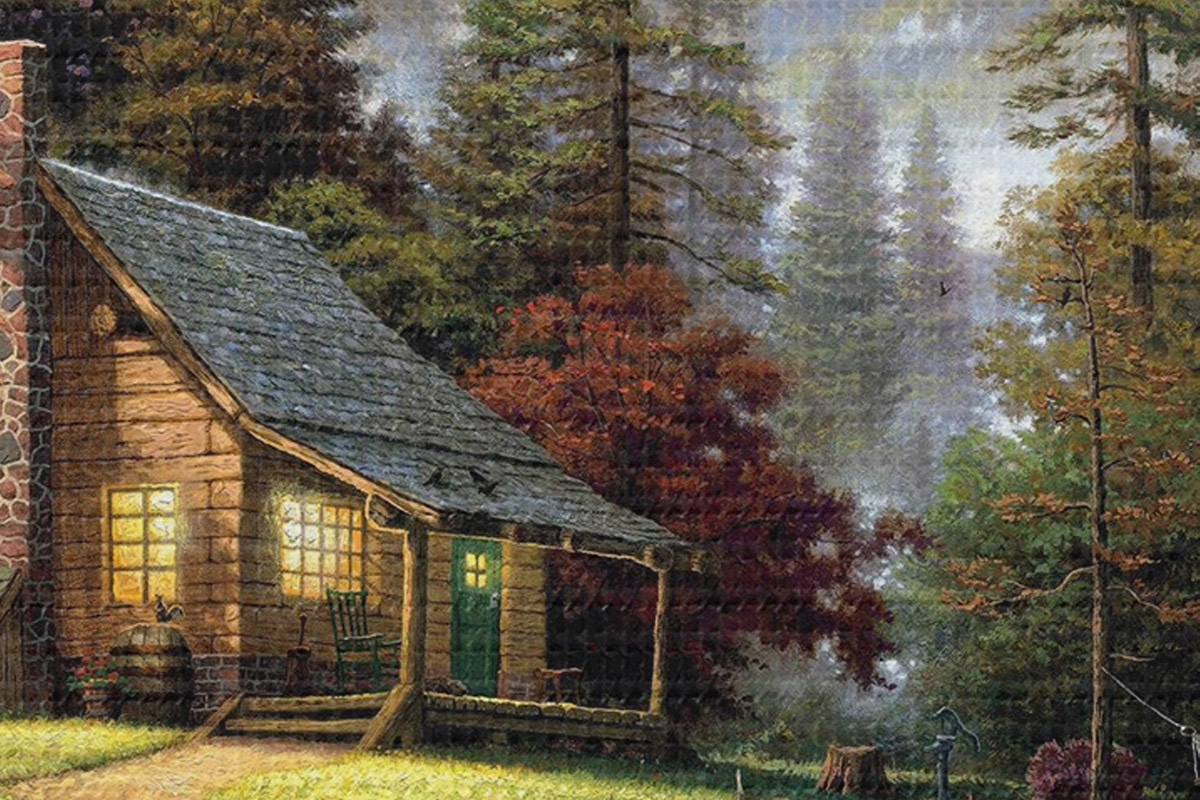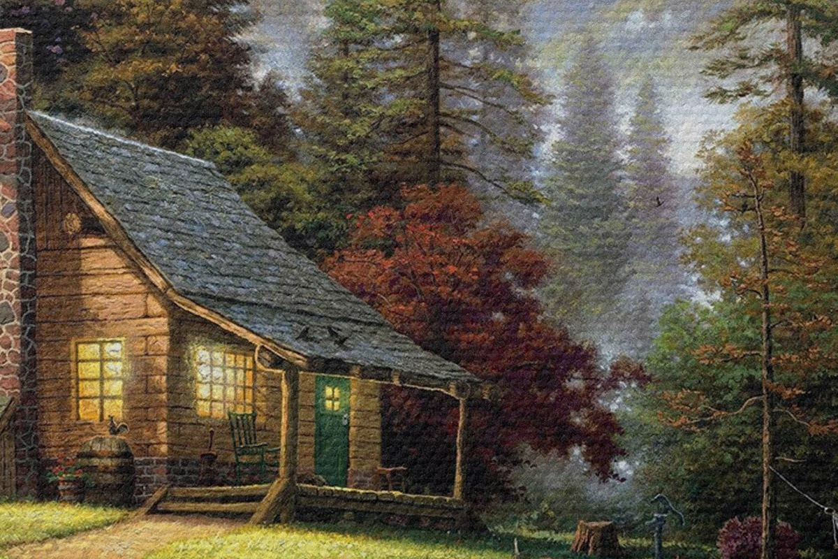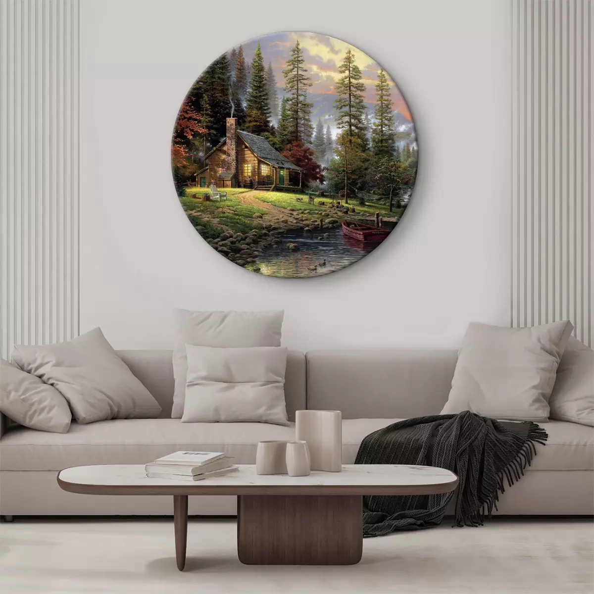 Кругла картина Рибальська хатина в лісі біля струмка Nr r15556