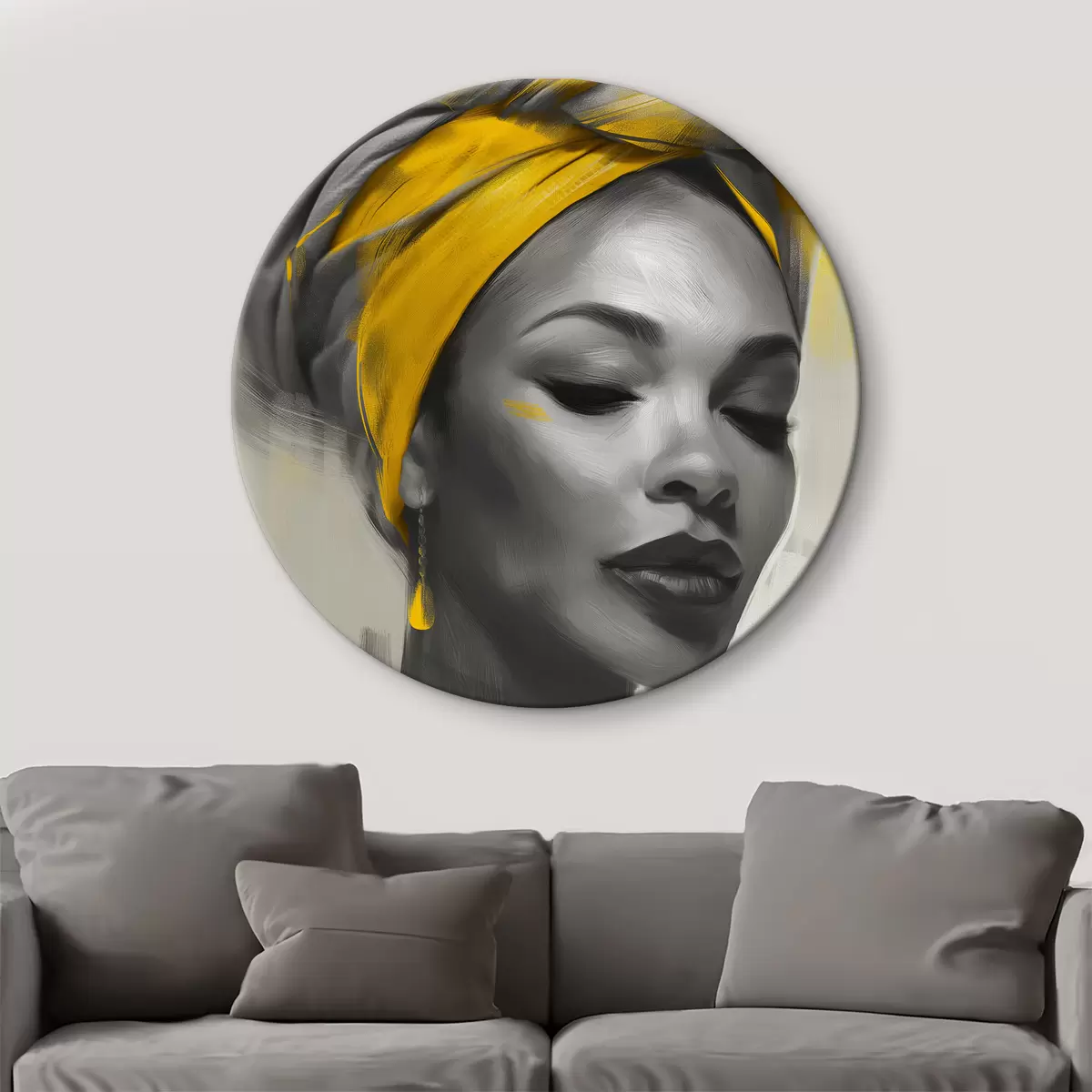 Кругла картина абстрактний чорно-білий портрет жінки в африканському стилі жовтою фарбою Nr r26119