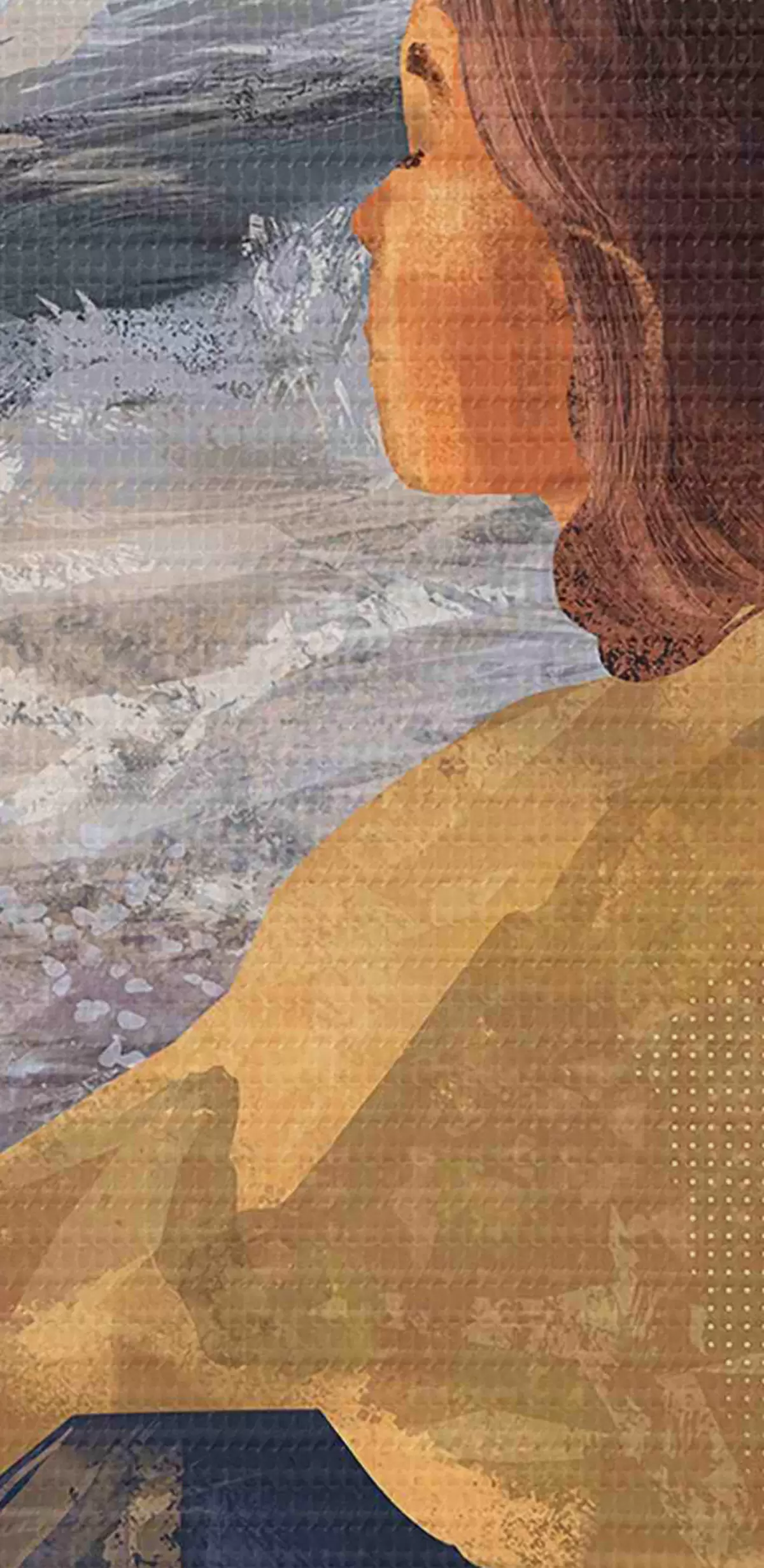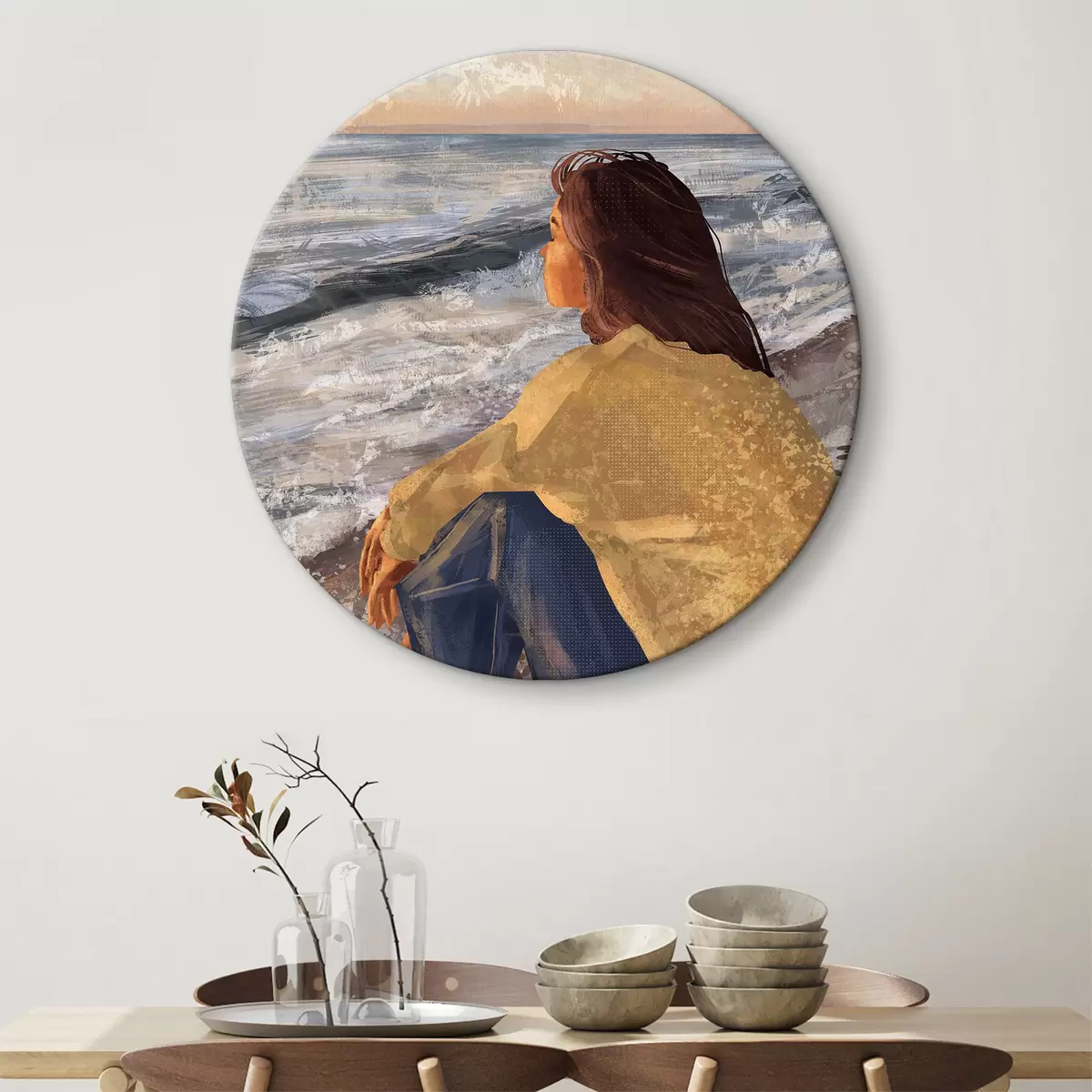 Кругла картина Жінка на березі моря, споглядає хвилі Nr r35317