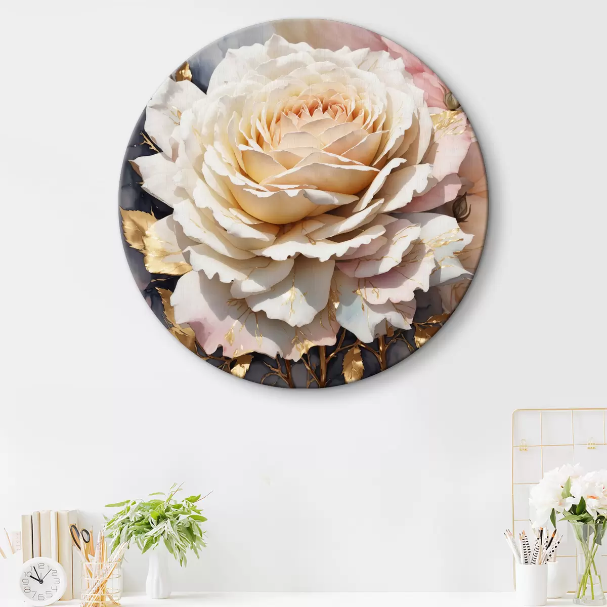 Кругла картина Біла троянда аквареллю з золотистим листям r35662