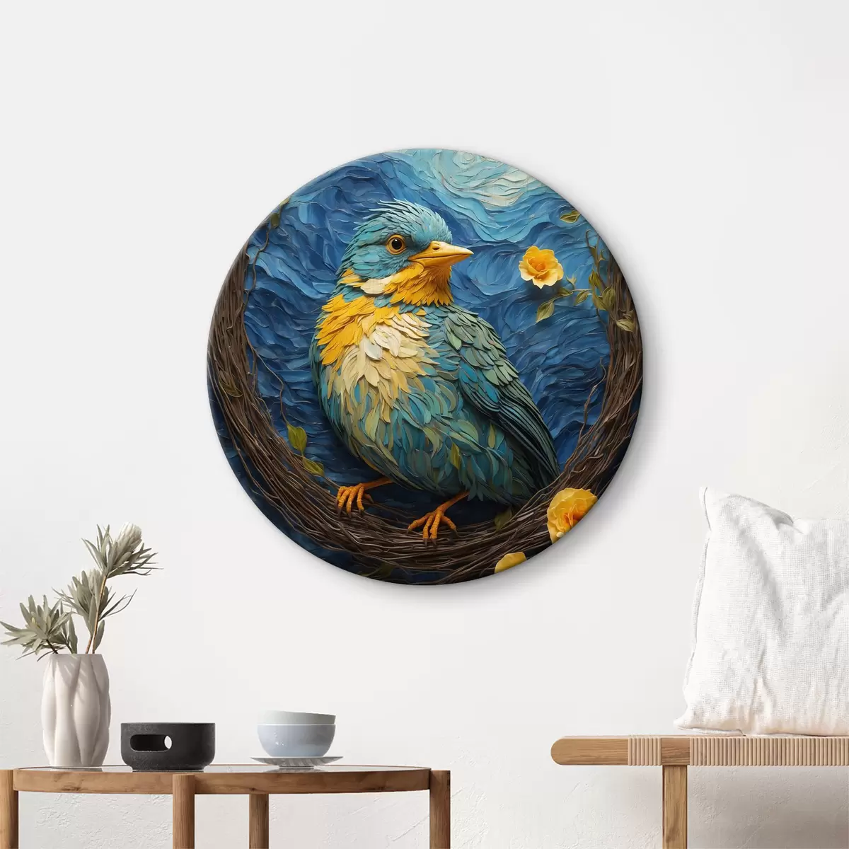 Кругла картина Яскраве гніздечко у спокійному квітковому вінку r36440