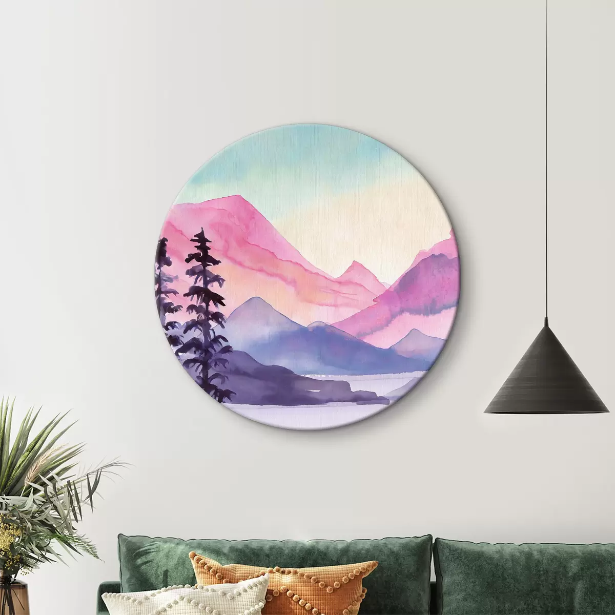 Кругла картина Акварель Гірський пейзаж, Схід сонця, м'які фіолетові, рожеві та блакитні кольори r36496