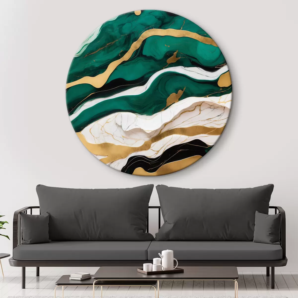 Кругла картина Акварельна абстракція на мармурі в зеленому, білому та золотому кольорах Nr r36645