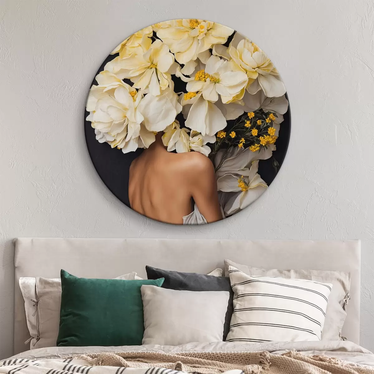 Кругла картина Жінка з жовтими квітами на чорному тлі r37162