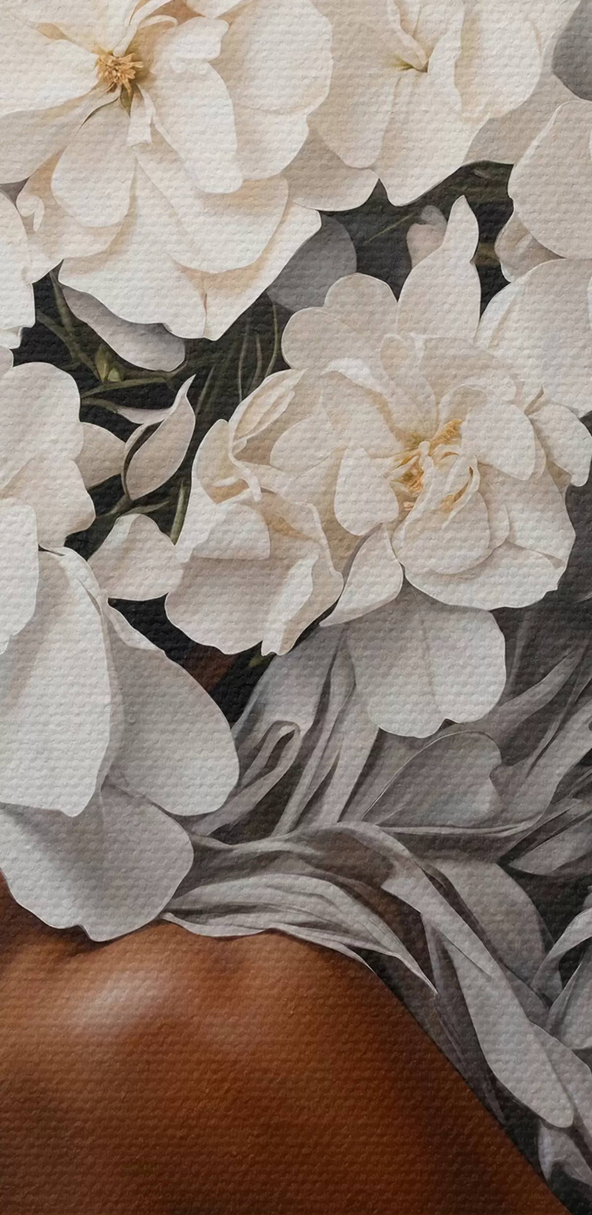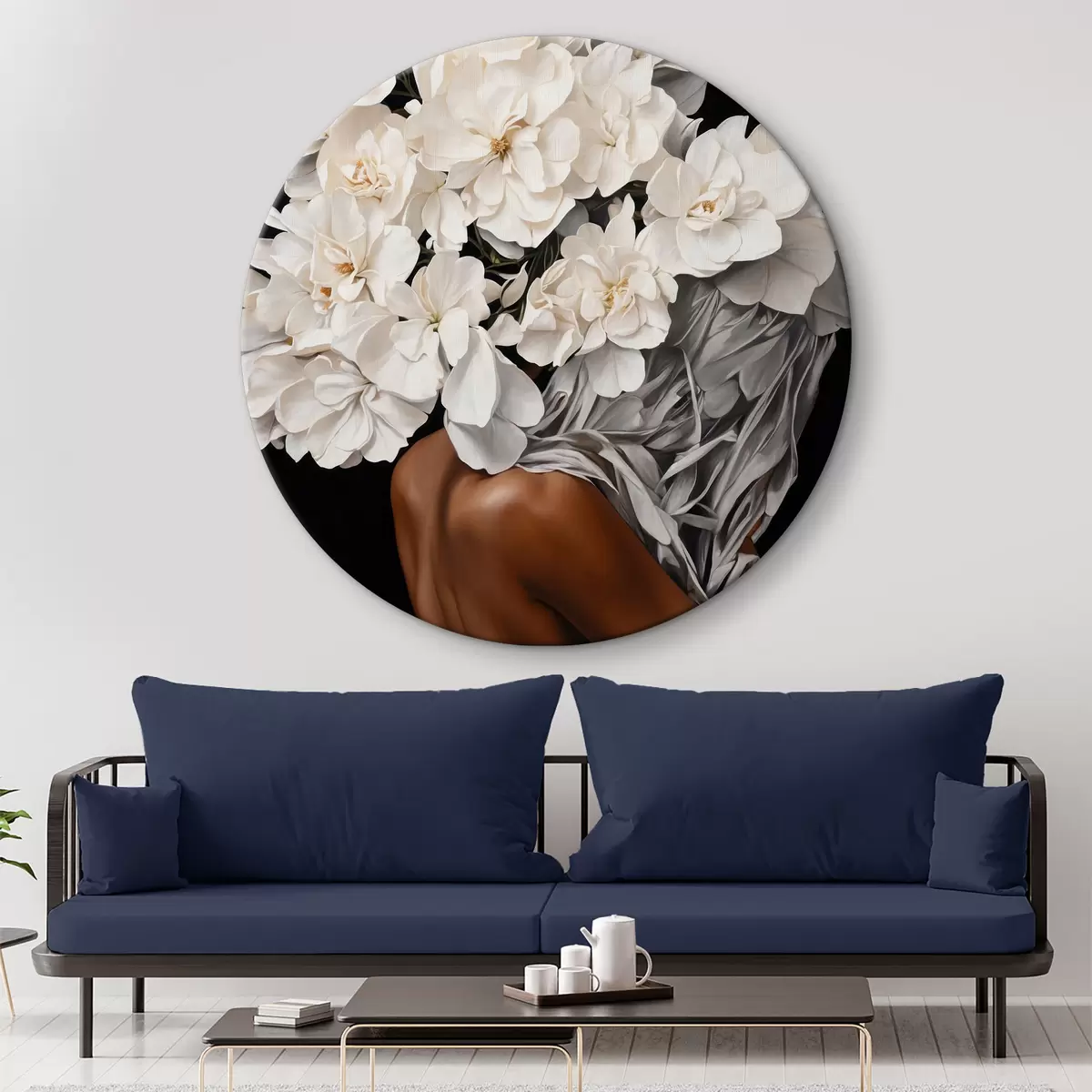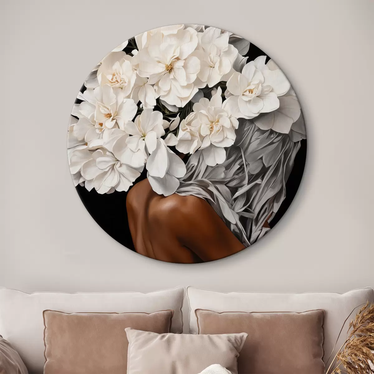 Кругла картина Жінка з білими квітами на чорному тлі r37163