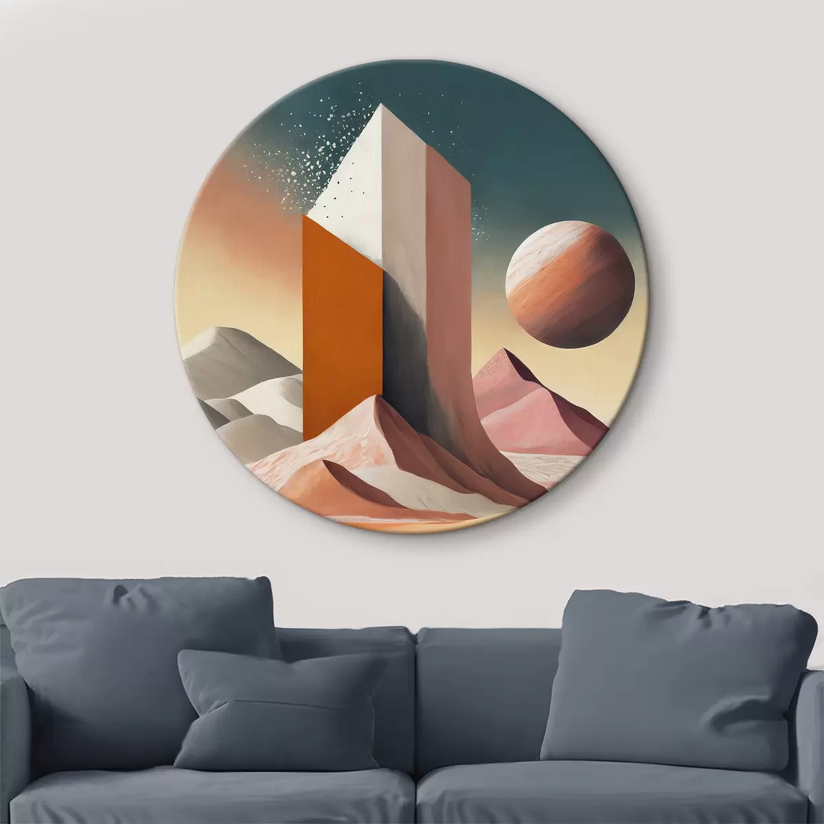 Кругла картина Футуристичне мистецтво, пустеля, геометричні фігури, пальми, рожевий і помаранчевий, планета Nr r37369