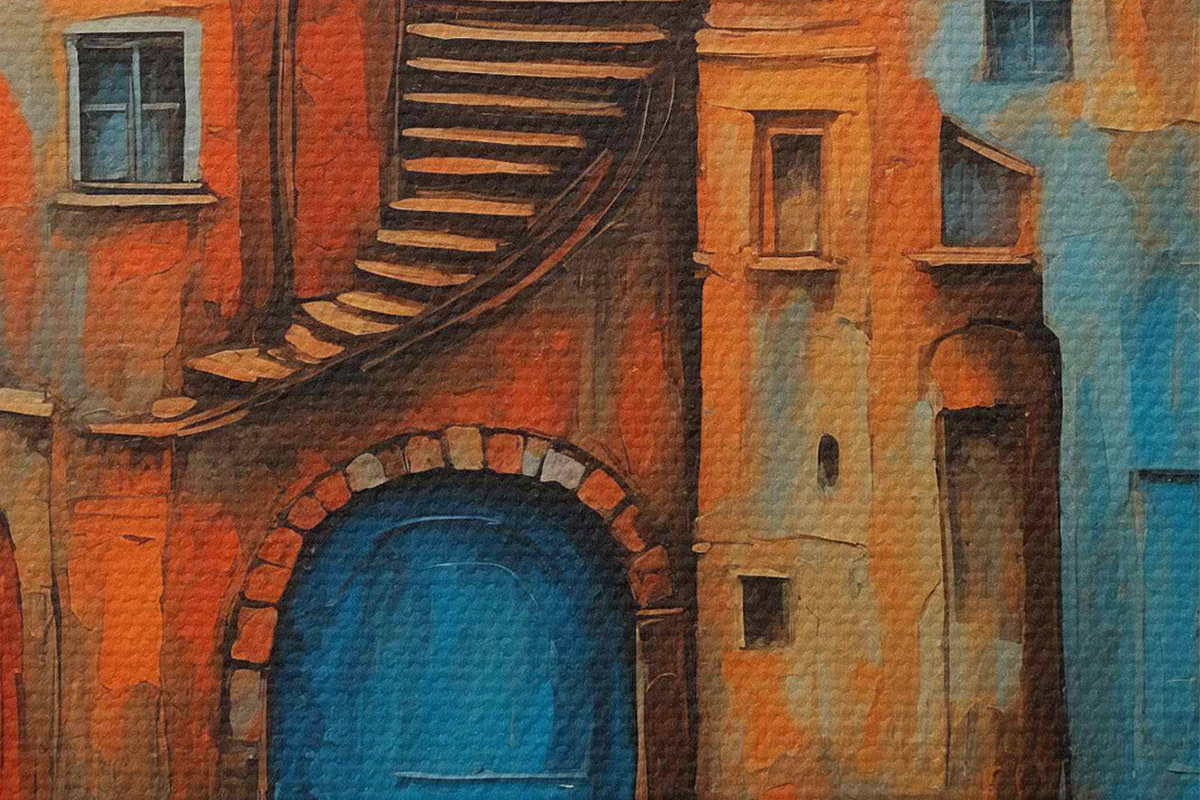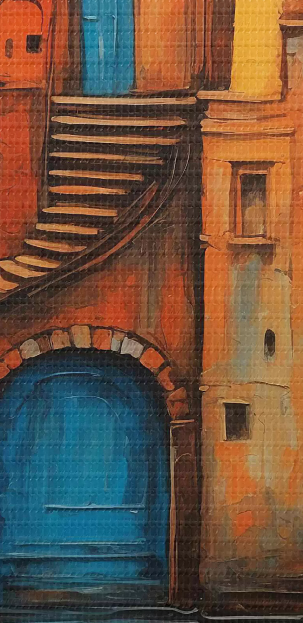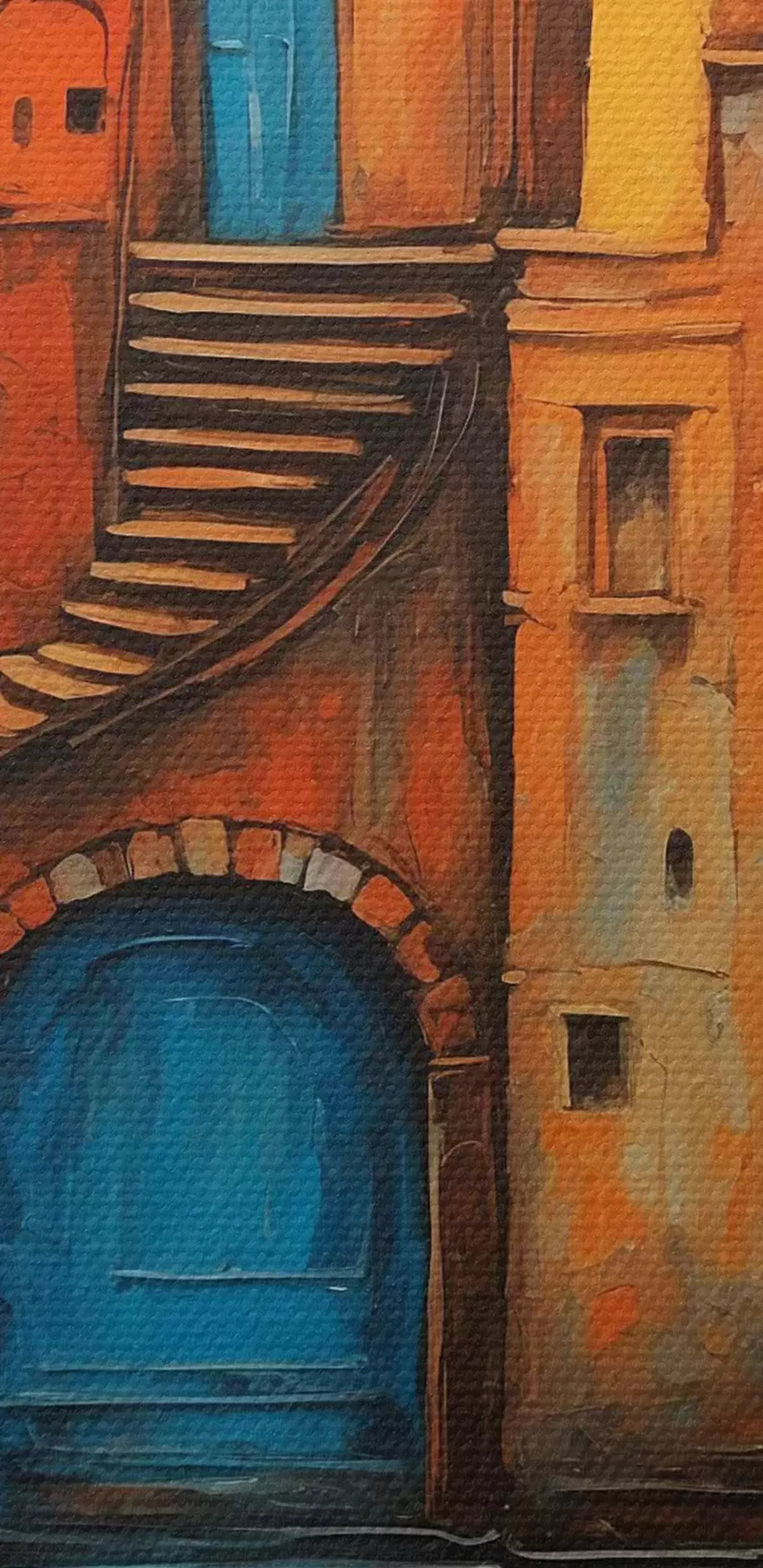 Кругла картина Зображення будівлі зі сходами та синіми дверима r37789