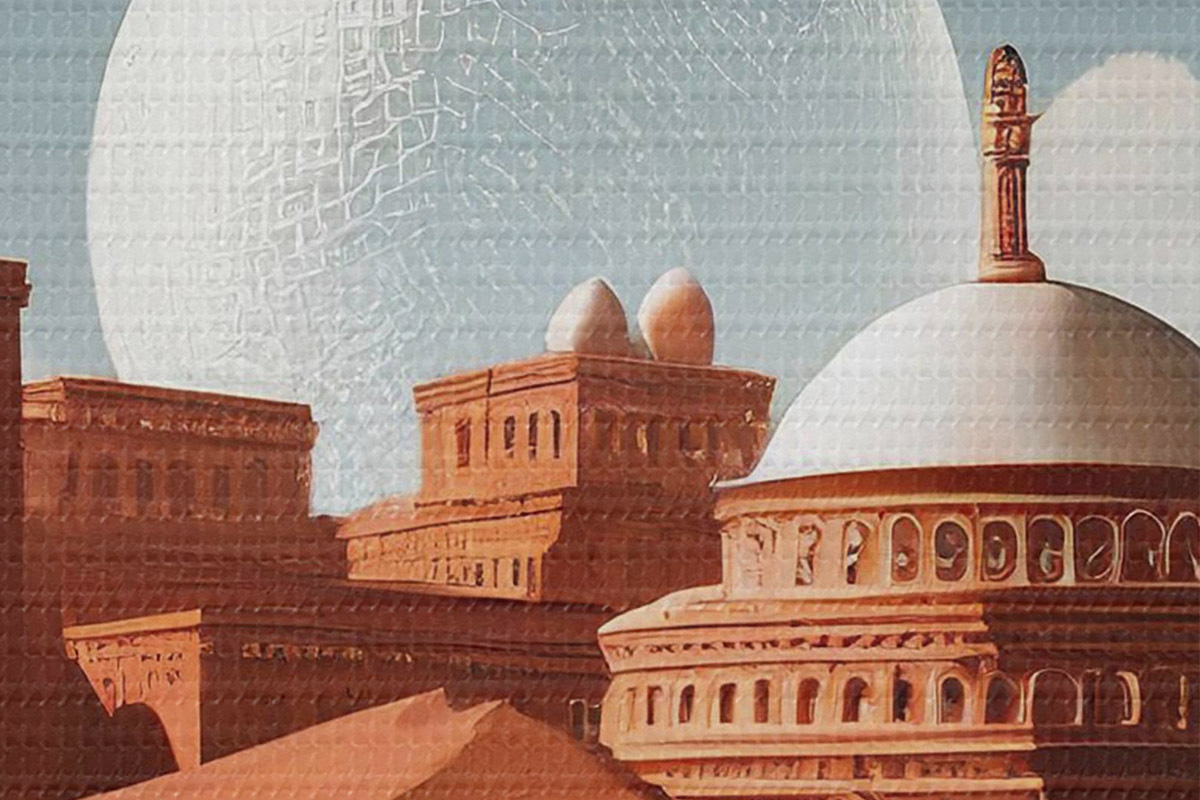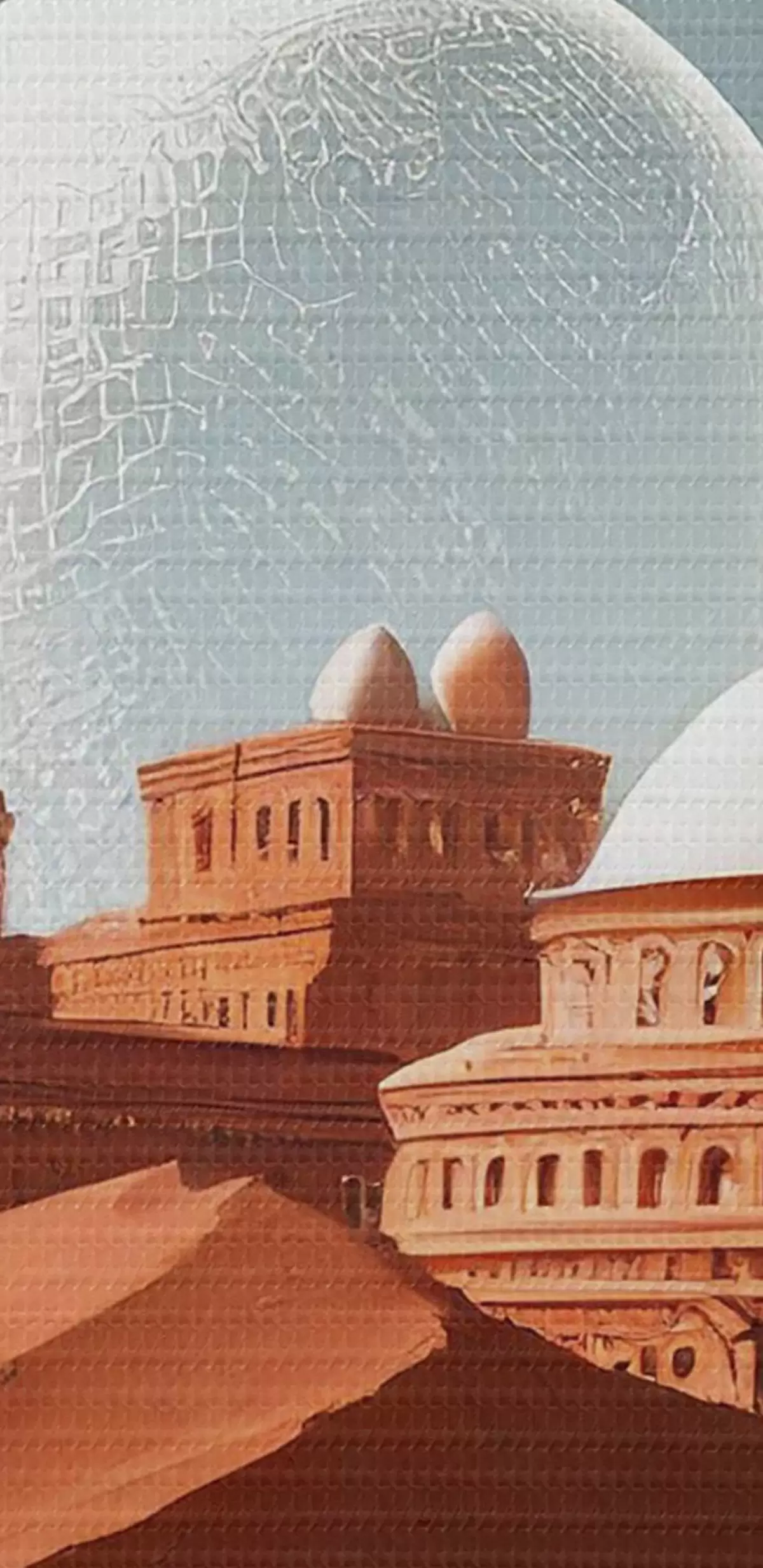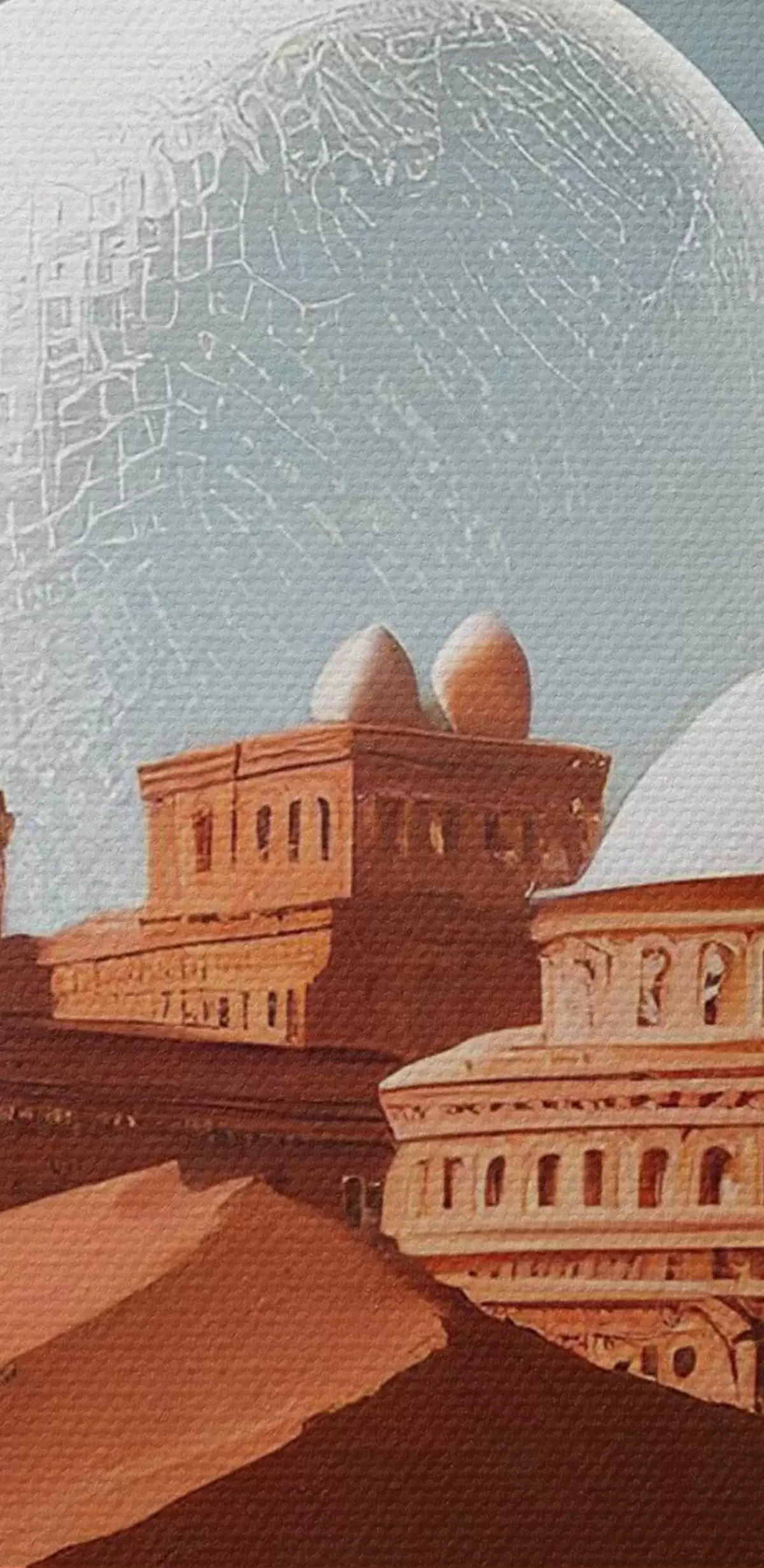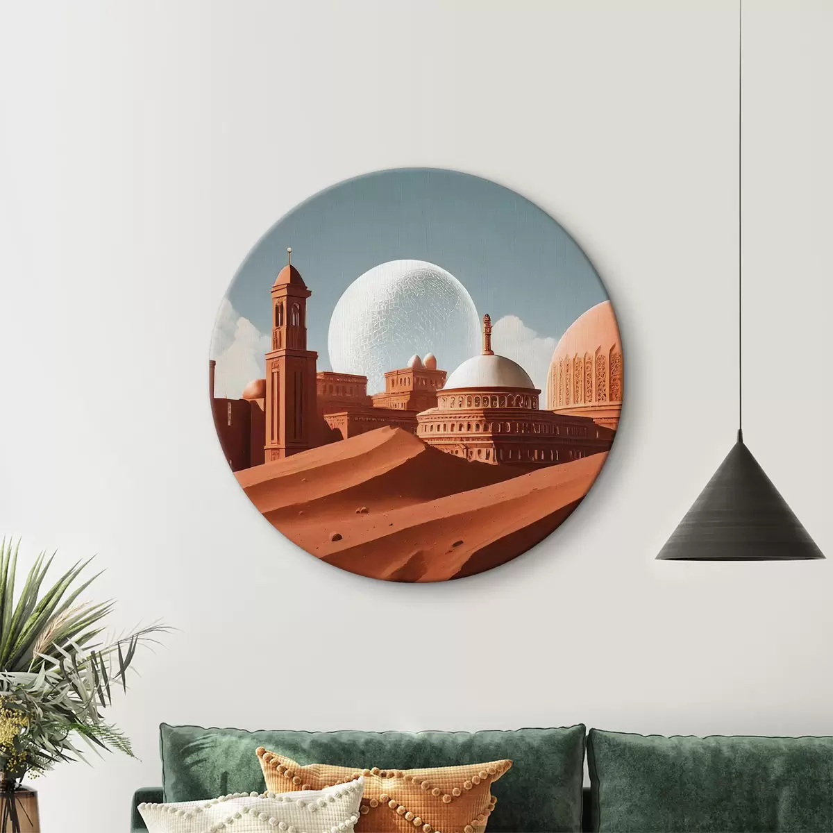 Кругла картина Пустельний пейзаж з будівлями та великою білою кулею Nr r37814