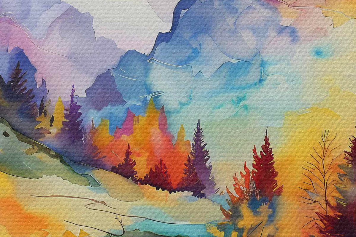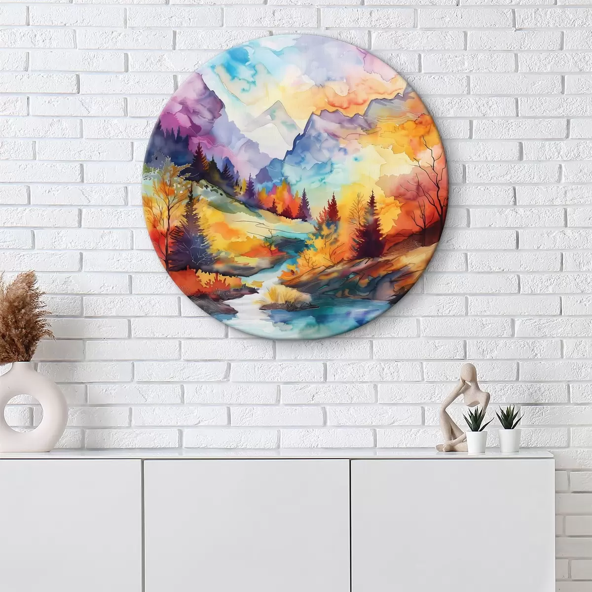 Кругла картина Барвистий гірський пейзаж з деревами та річкою Nr r38145