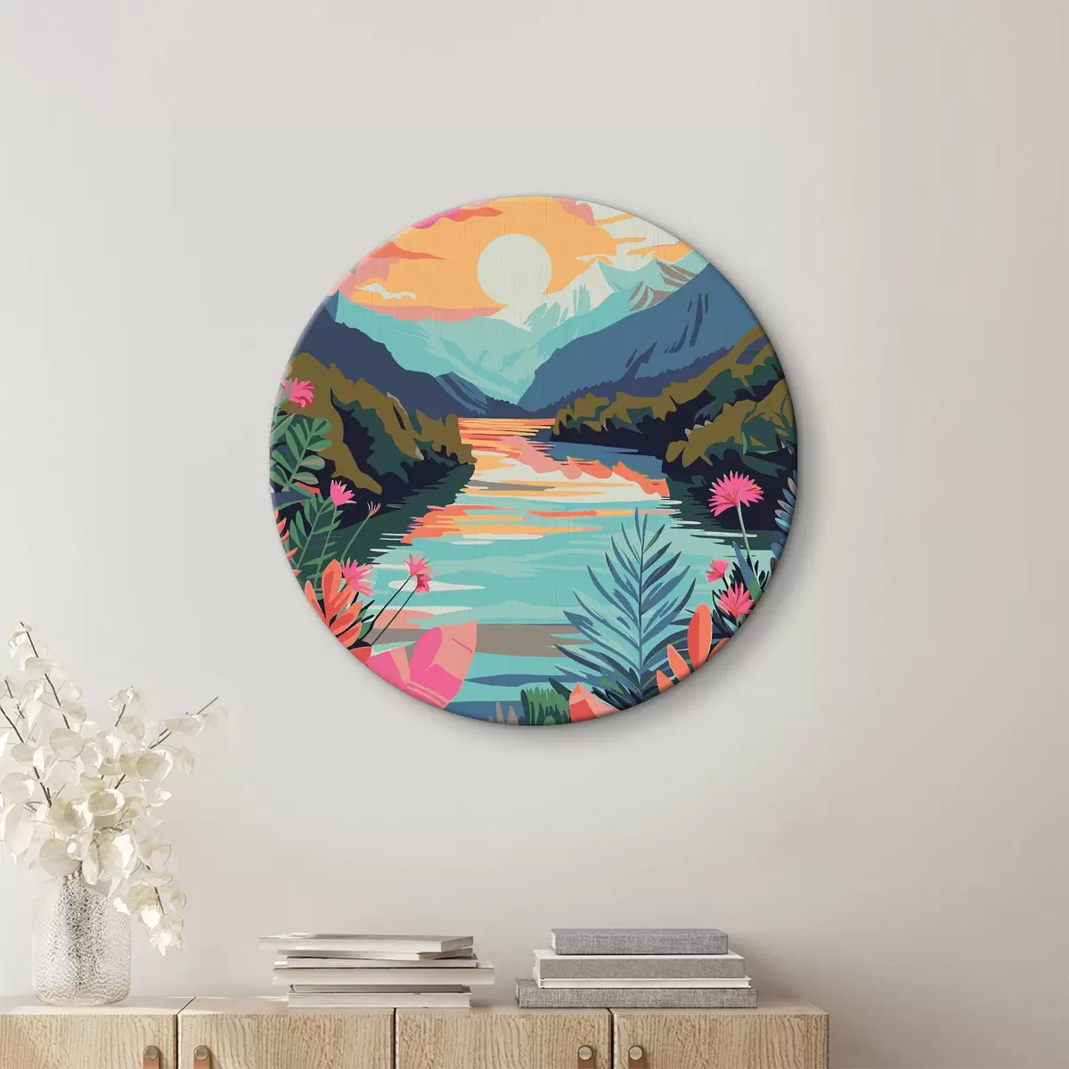Кругла картина Річка з квітами та горами на задньому плані Nr r38266