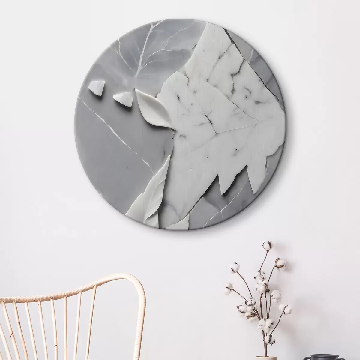 Кругла картина Біло-сіра мармурова поверхня з листям Nr r38272