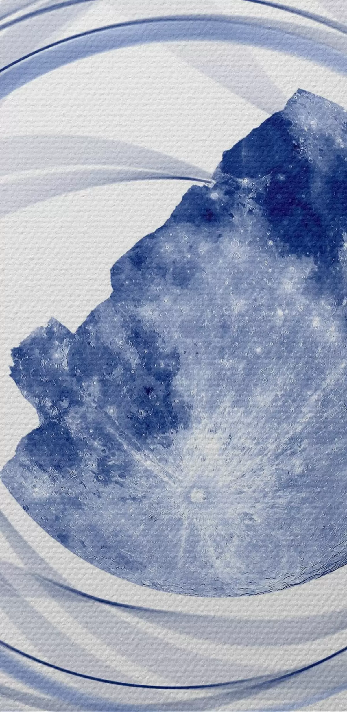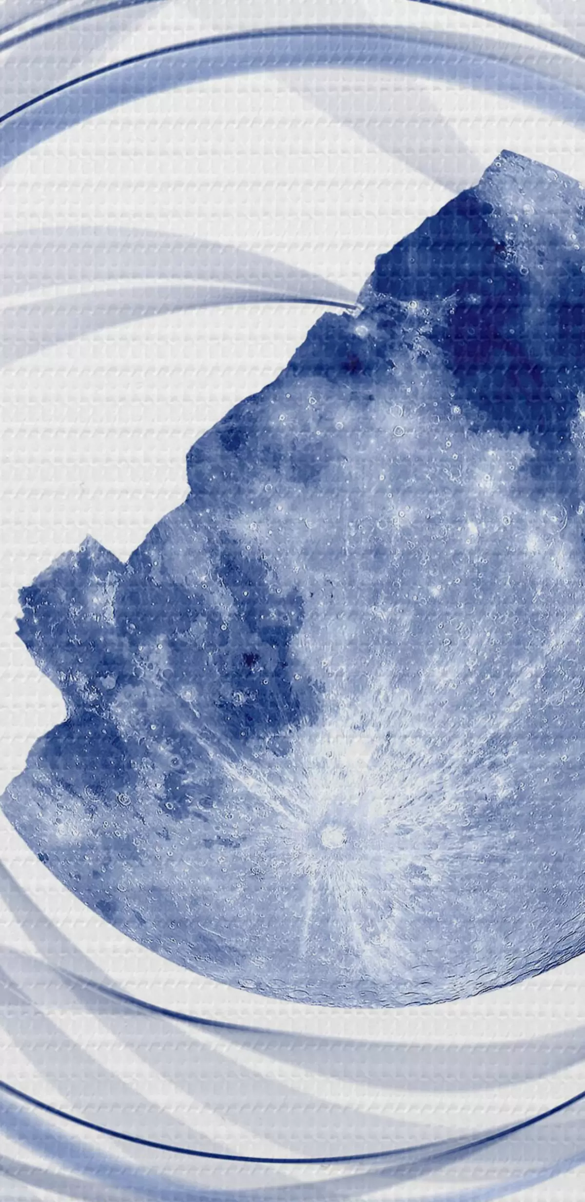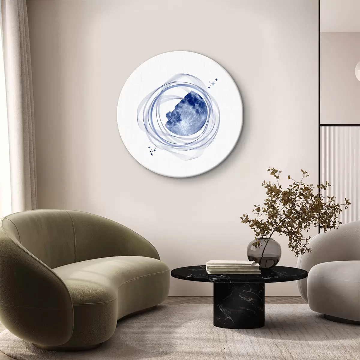 Кругла картина орбіта місяця, півмісяць, мінімалізм, простір, час, вигнуті розмиті лінії, зірки, галактика, синій колір Nr r38280