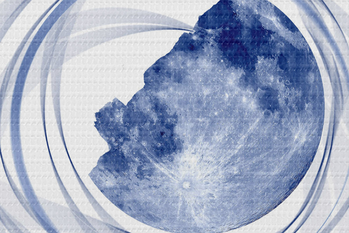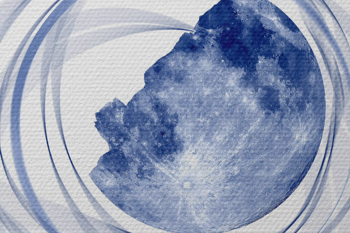 Кругла картина орбіта місяця, півмісяць, мінімалізм, простір, час, вигнуті розмиті лінії, зірки, галактика, синій колір r38280