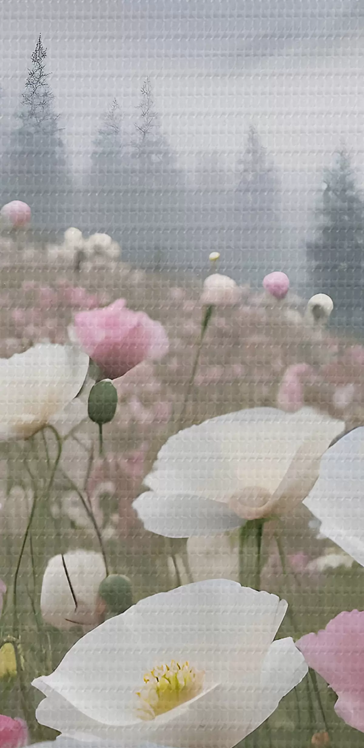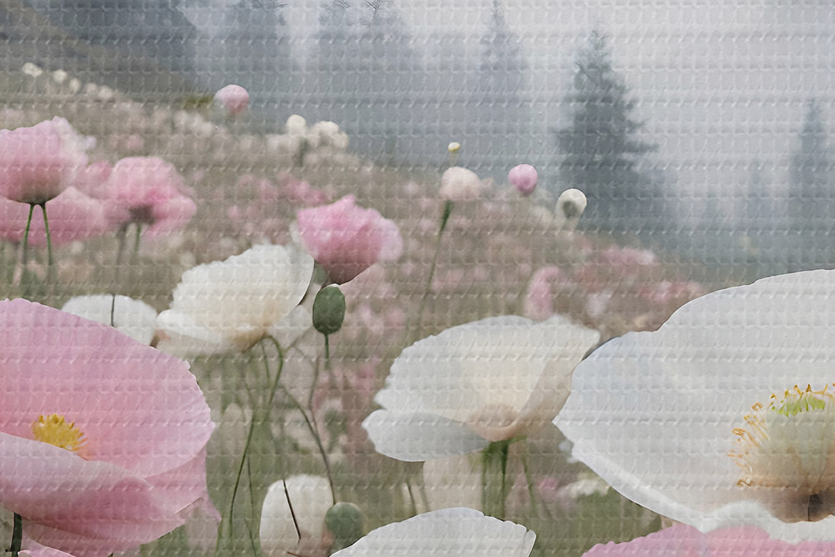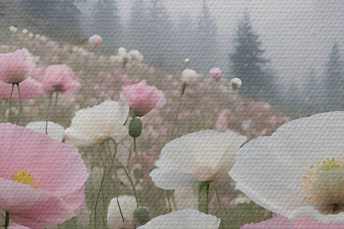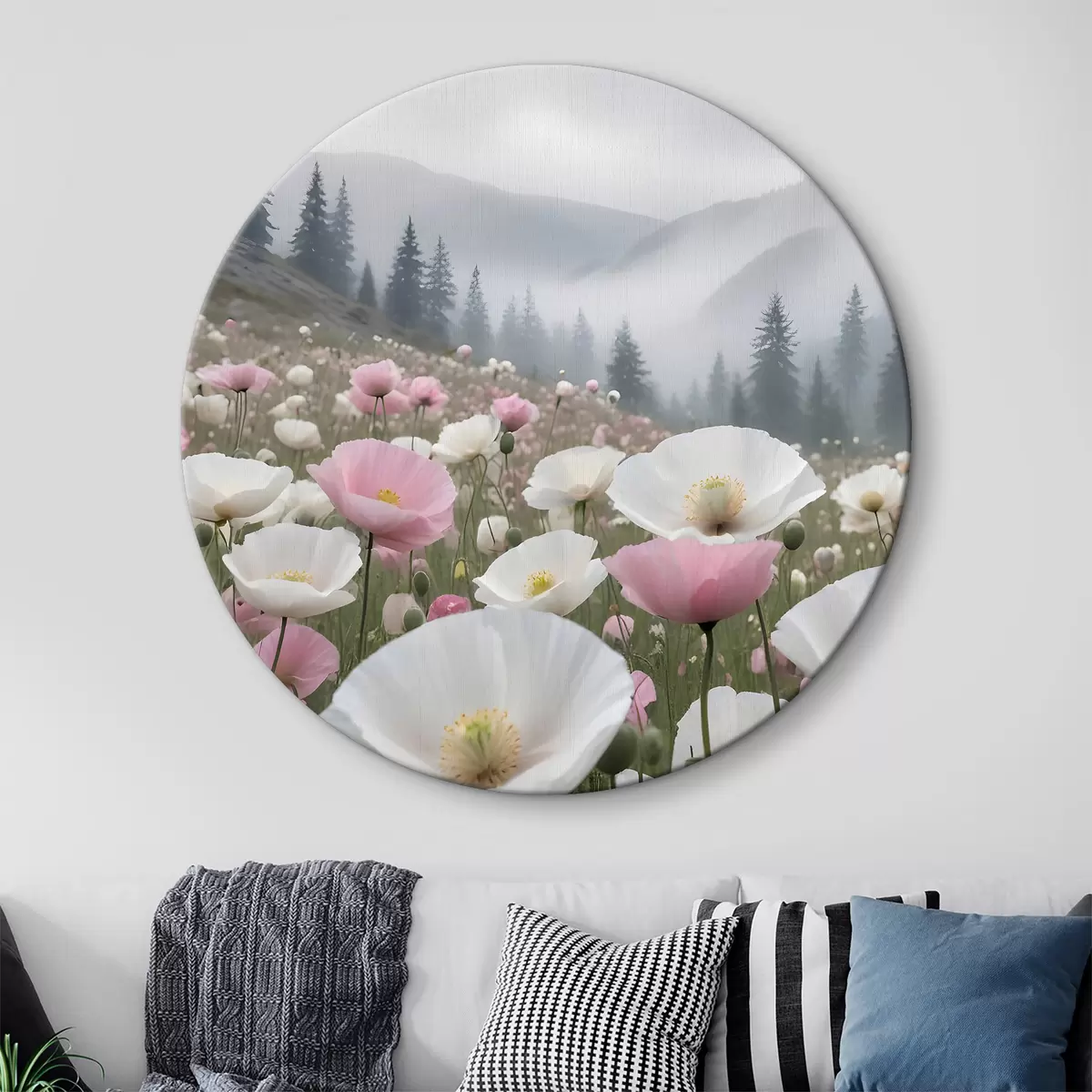 Кругла картина Поле рожевих і білих маків у гірському ландшафті на задньому плані Nr r38369