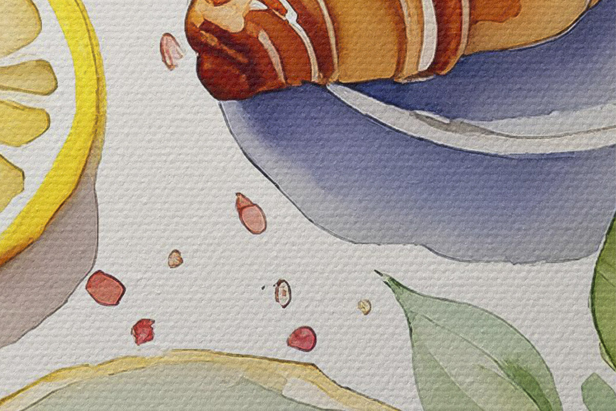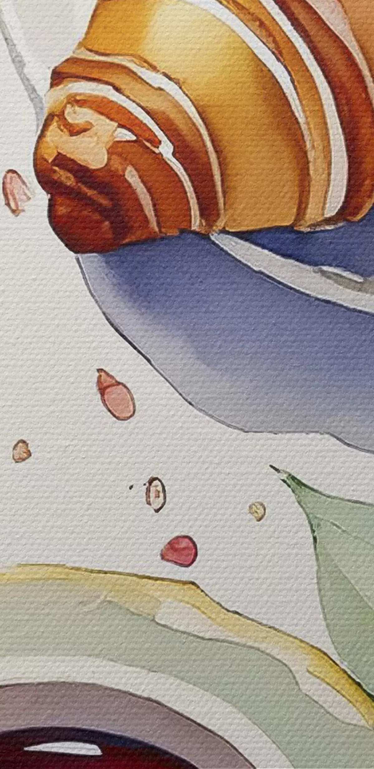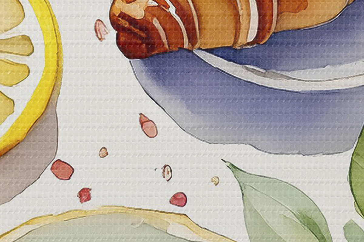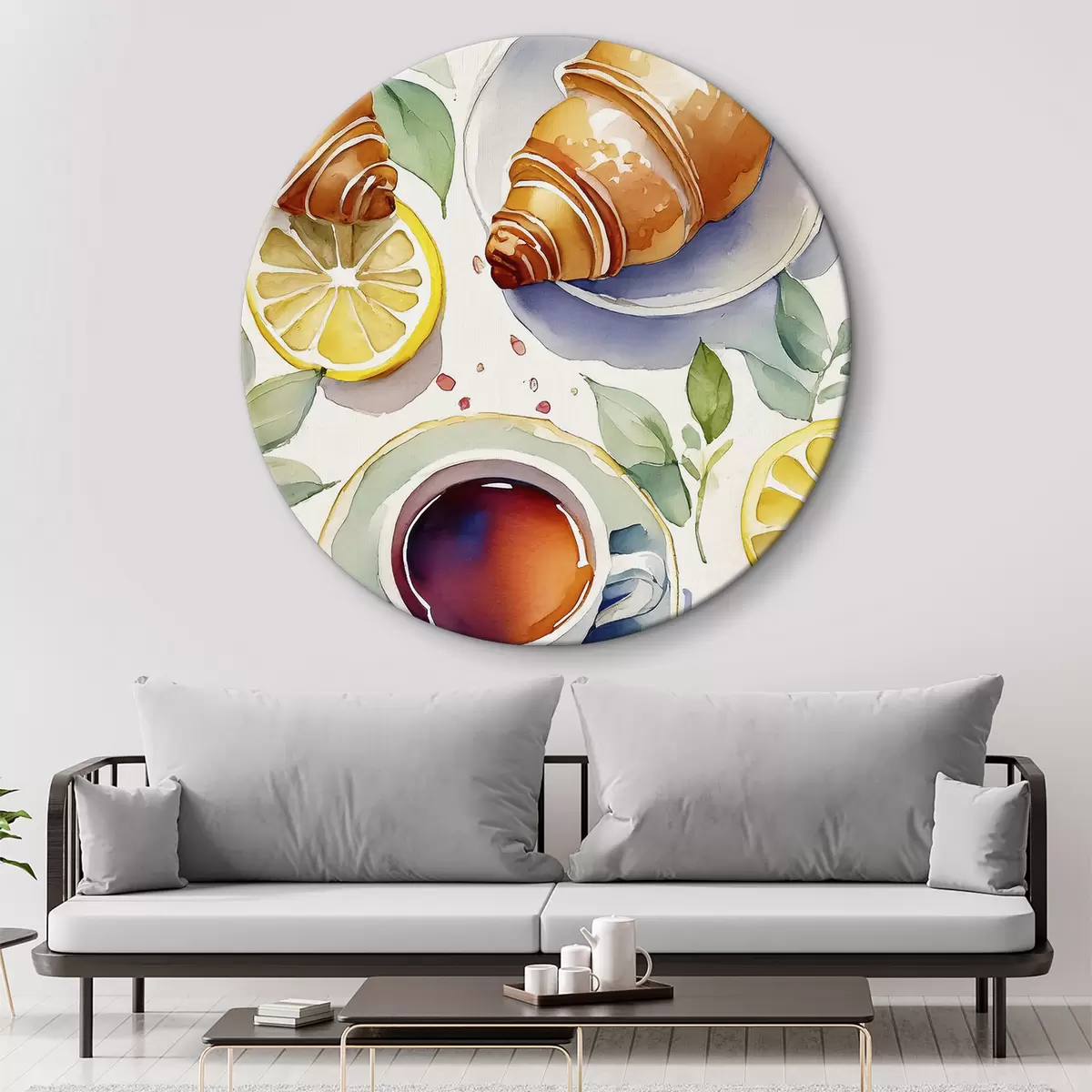 Кругла картина Круасан акварель, чашка чаю, сніданок, лимони, сільському стилі Nr r38389