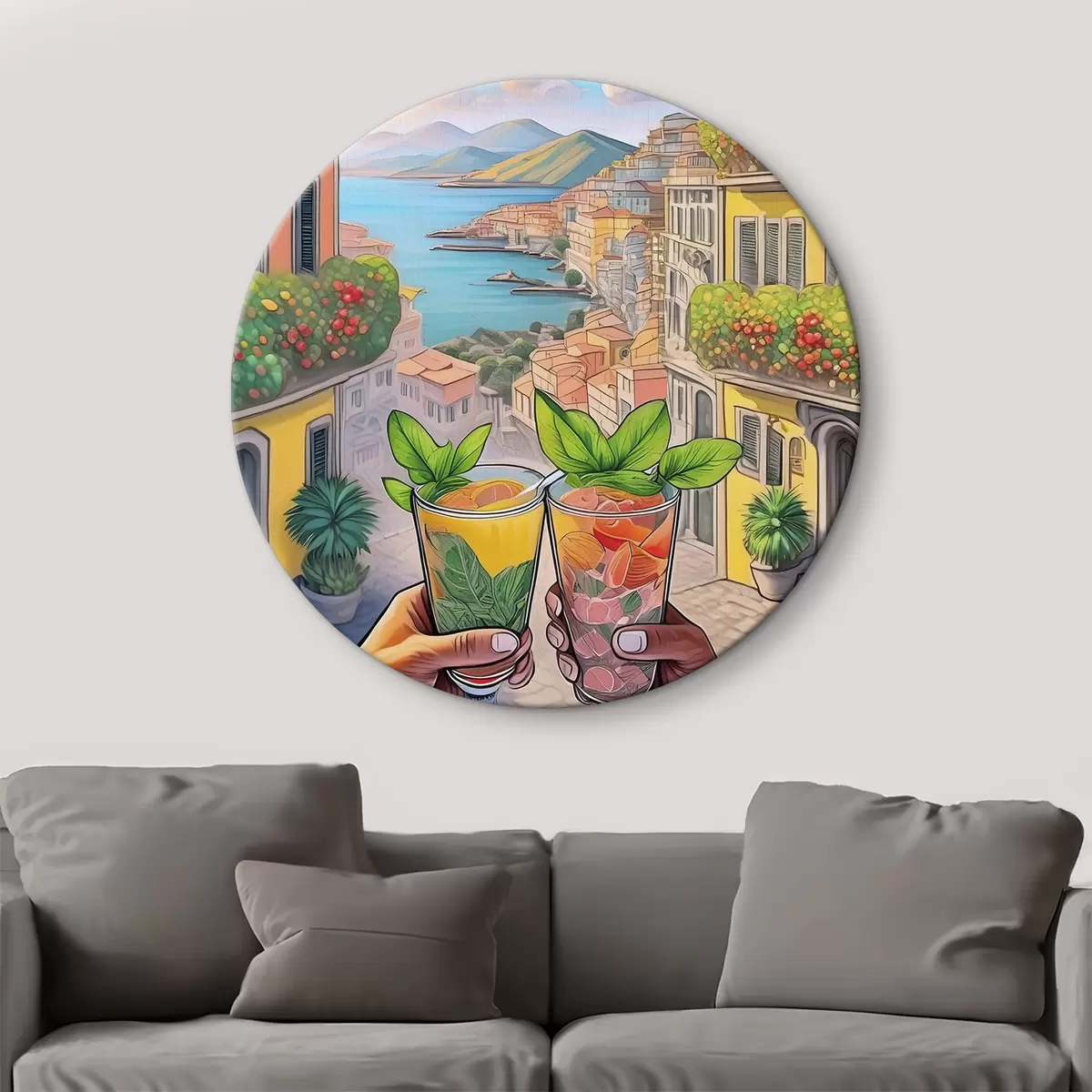 Кругла картина Італійське місто, морське узбережжя, коктейлі, покликання, архітектура, літо, акварель Nr r38392