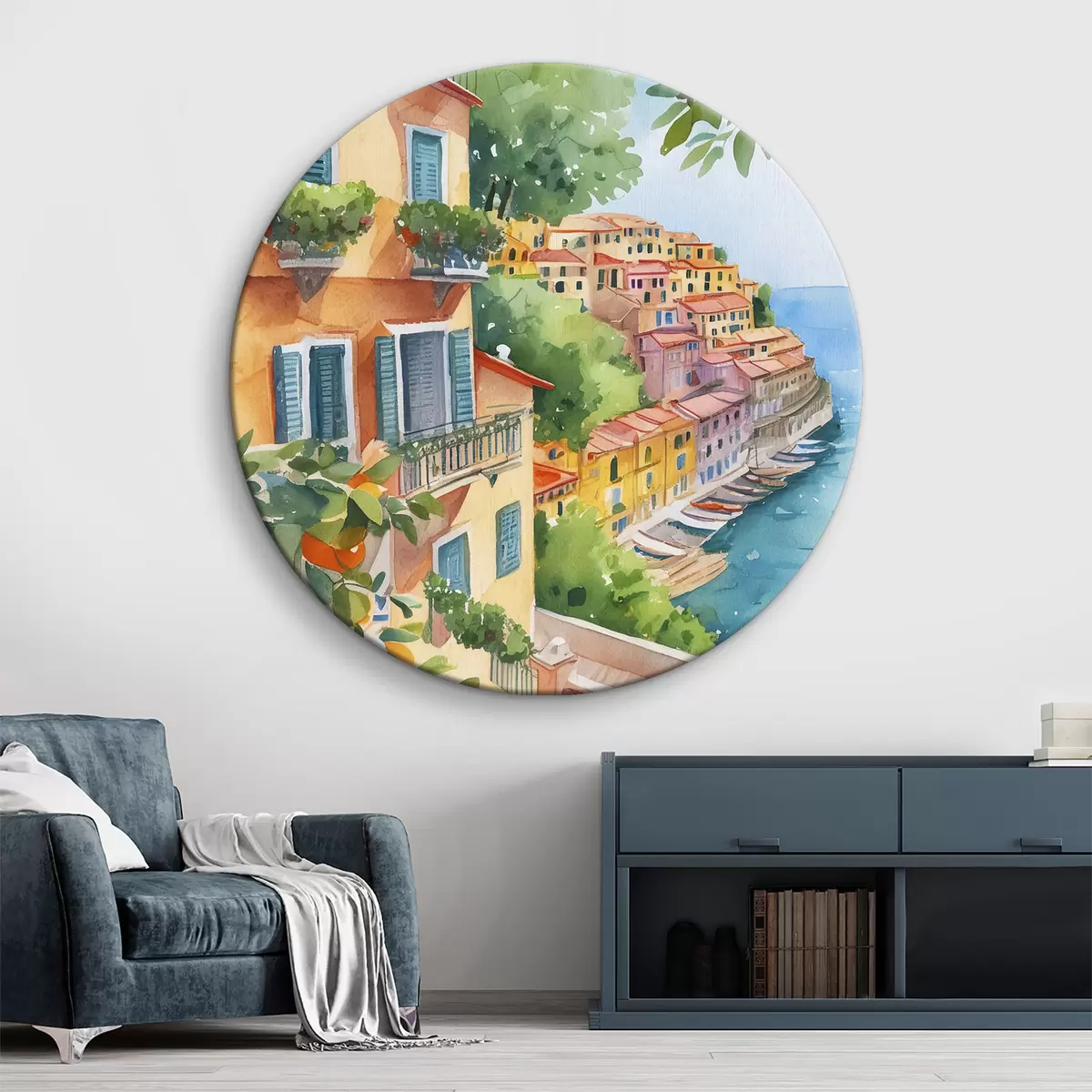 Кругла картина Архітектура італійського міста, узбережжя Амальфітанського моря, літо, акварель, лимонне дерево r38393