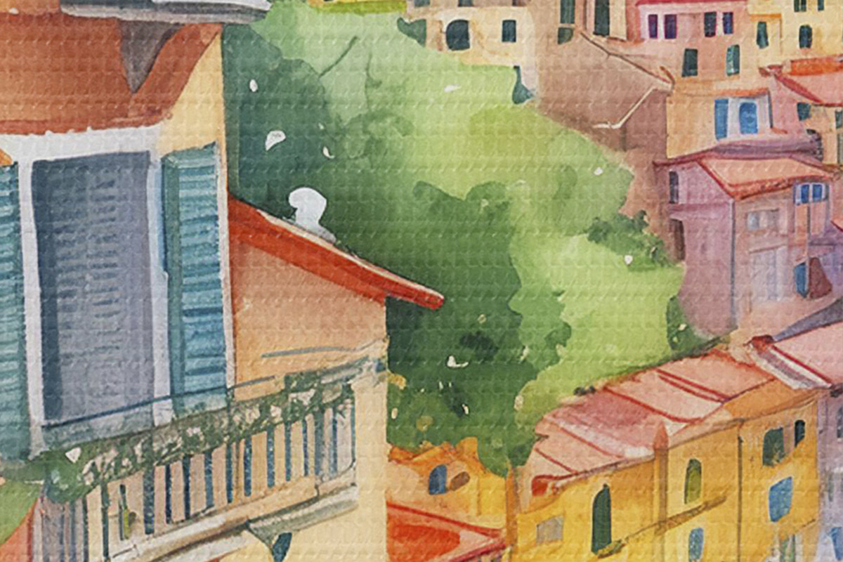 Кругла картина Архітектура італійського міста, узбережжя Амальфітанського моря, літо, акварель, лимонне дерево Nr r38393