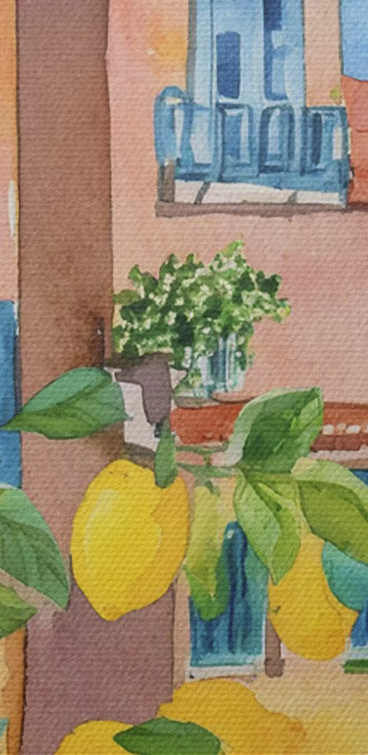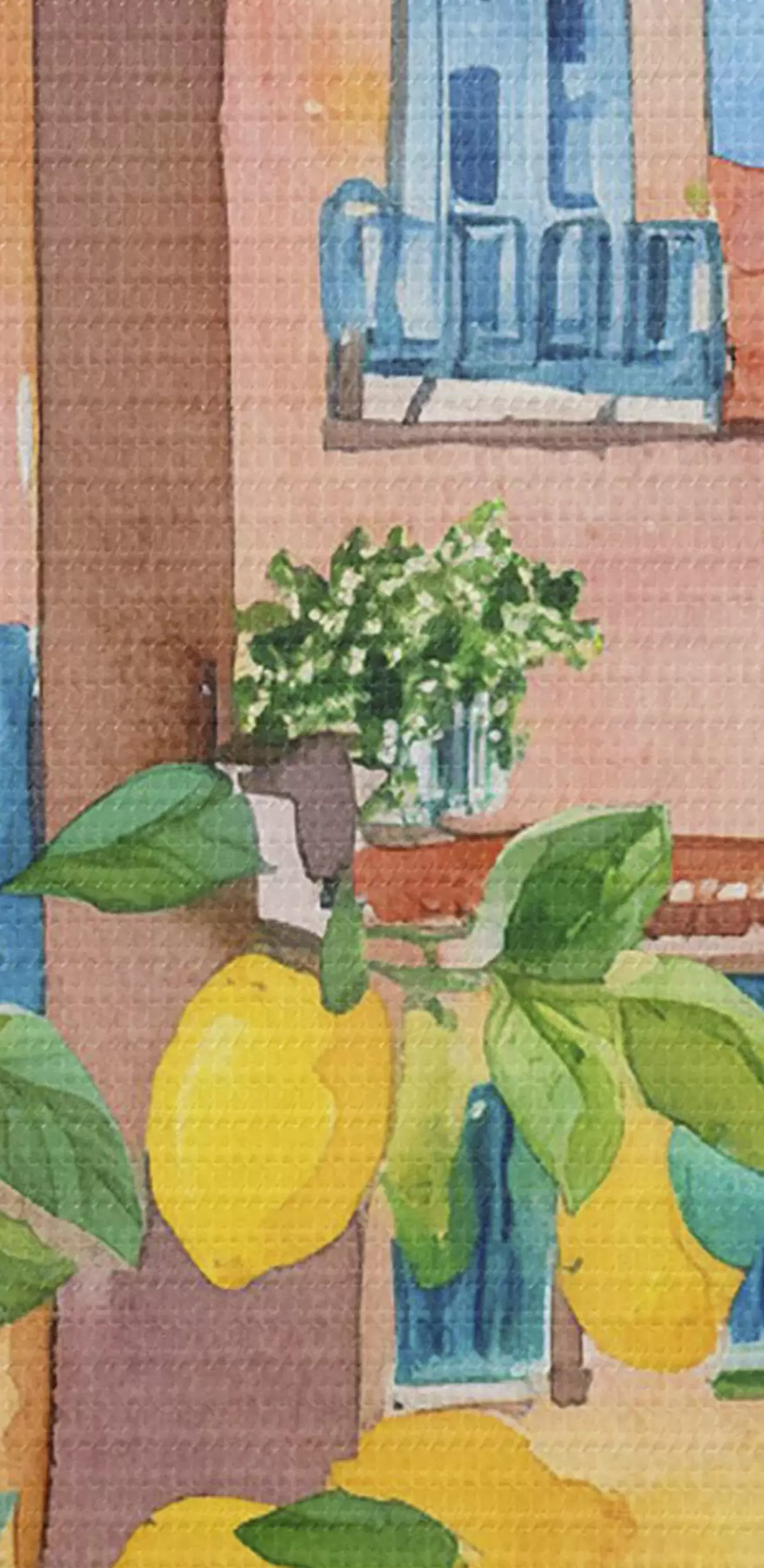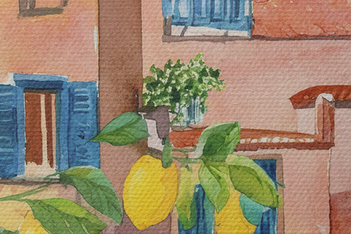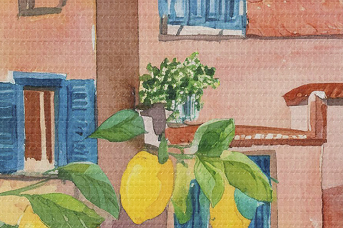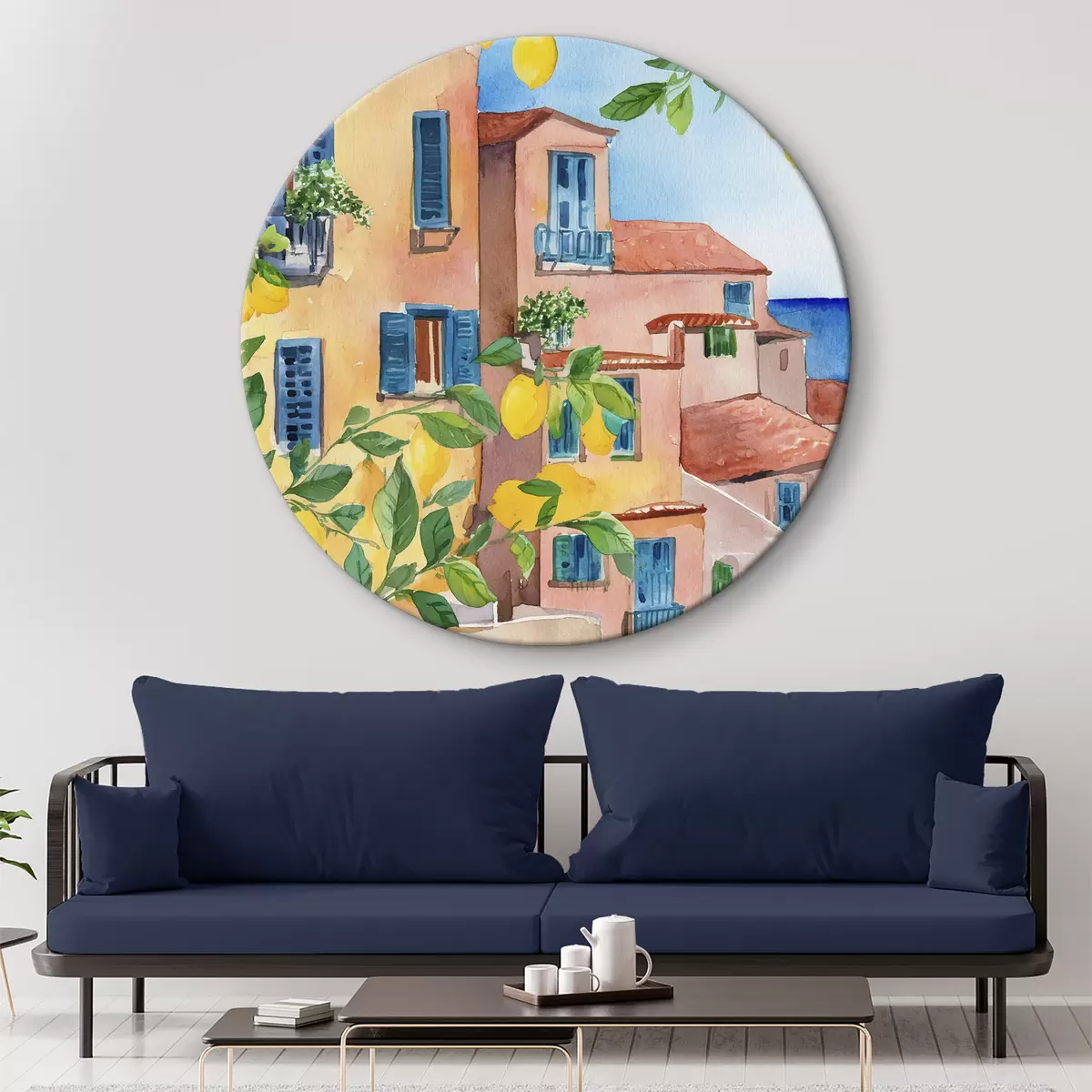 Кругла картина Архітектура італійського міста, морське узбережжя, літо, акварель, лимонне дерево Nr r38395
