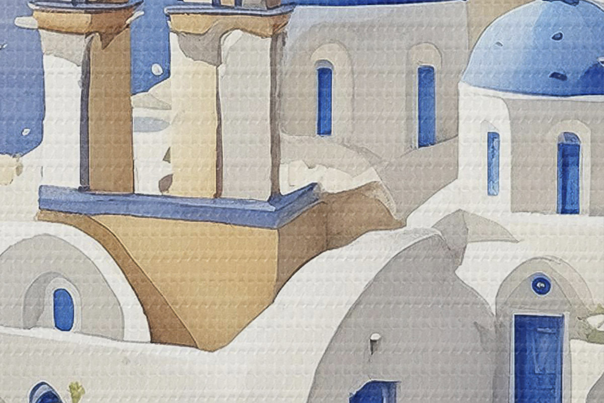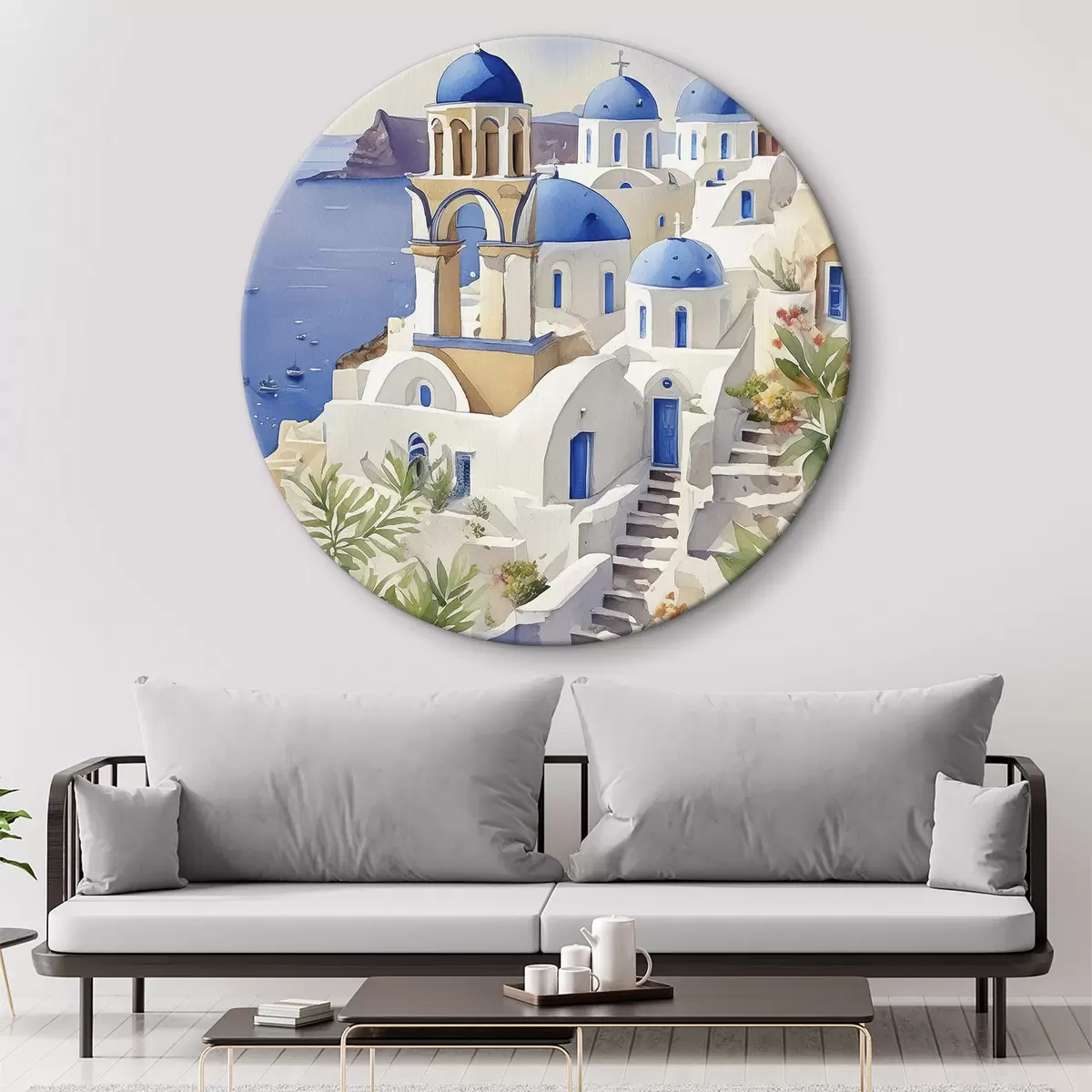 Кругла картина Санторіні, Греція архітектура, акварель, літо, узбережжя Середземного моря Nr r38400