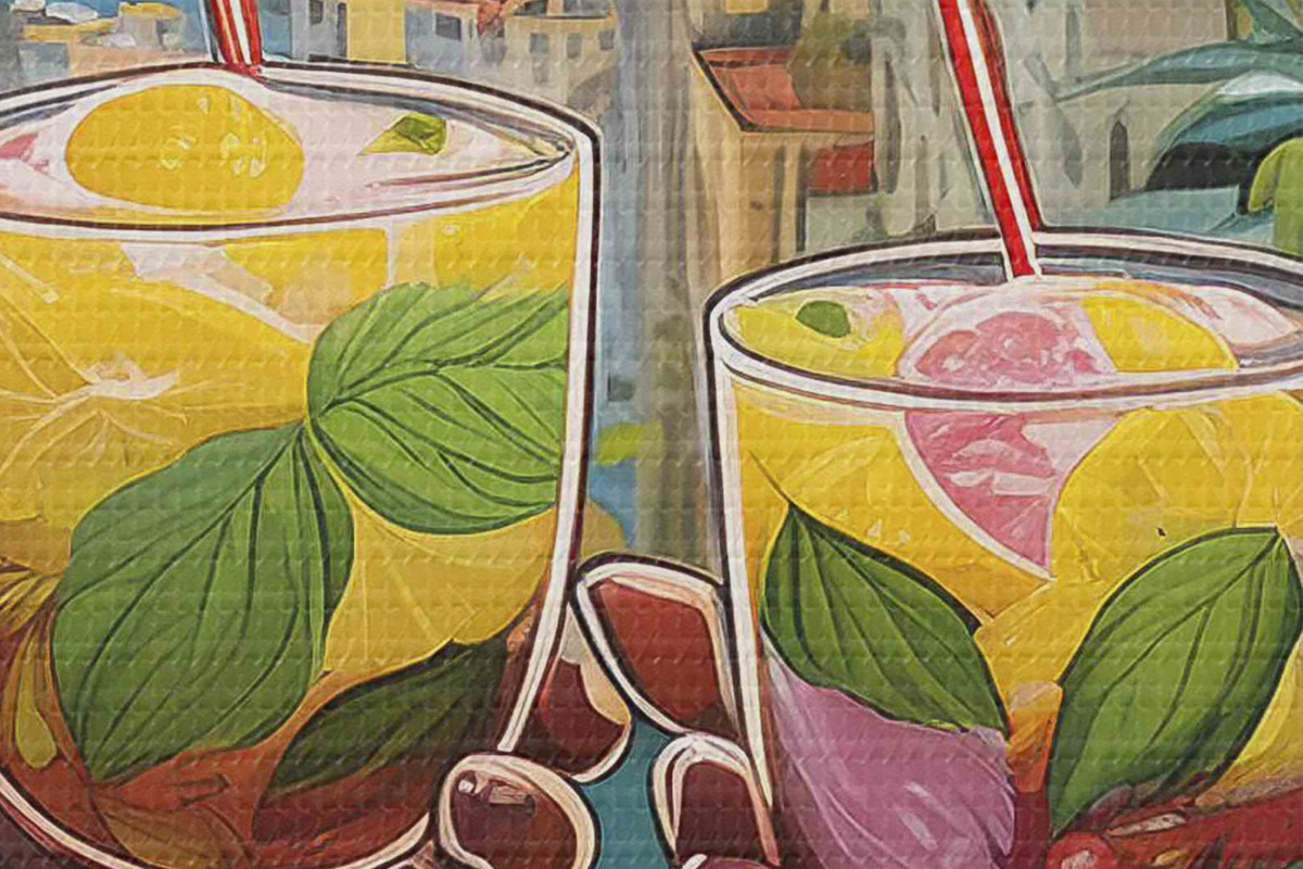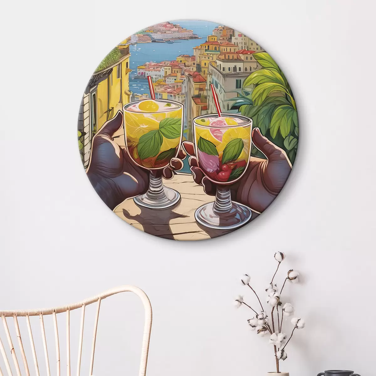 Кругла картина Пара рук тримає склянки з фруктами та листям. Nr r38405