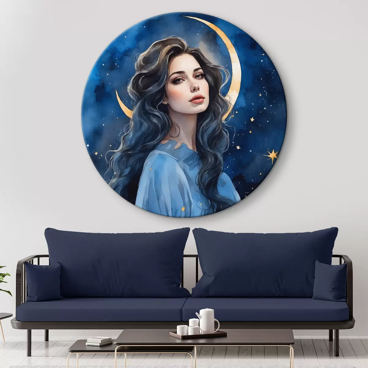 Кругла картина Дівчина в блакитній сукні на тлі півмісяця та зірок Nr r38427