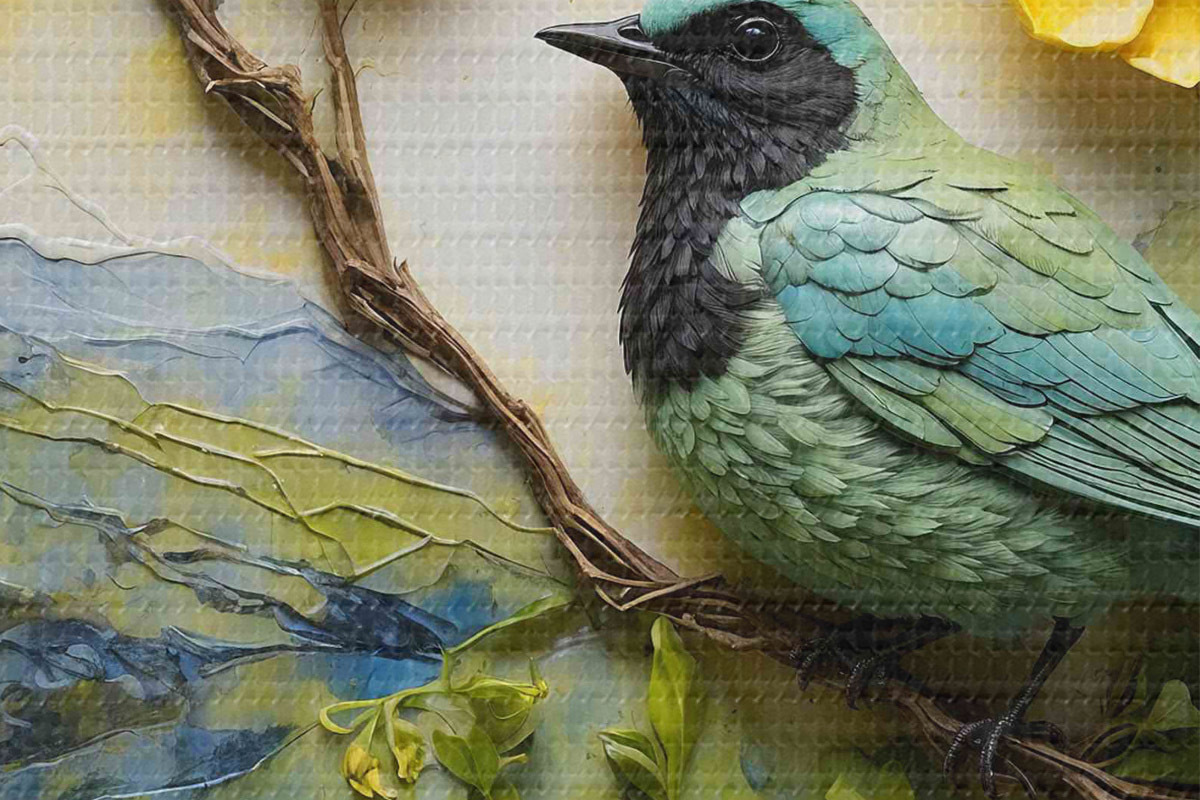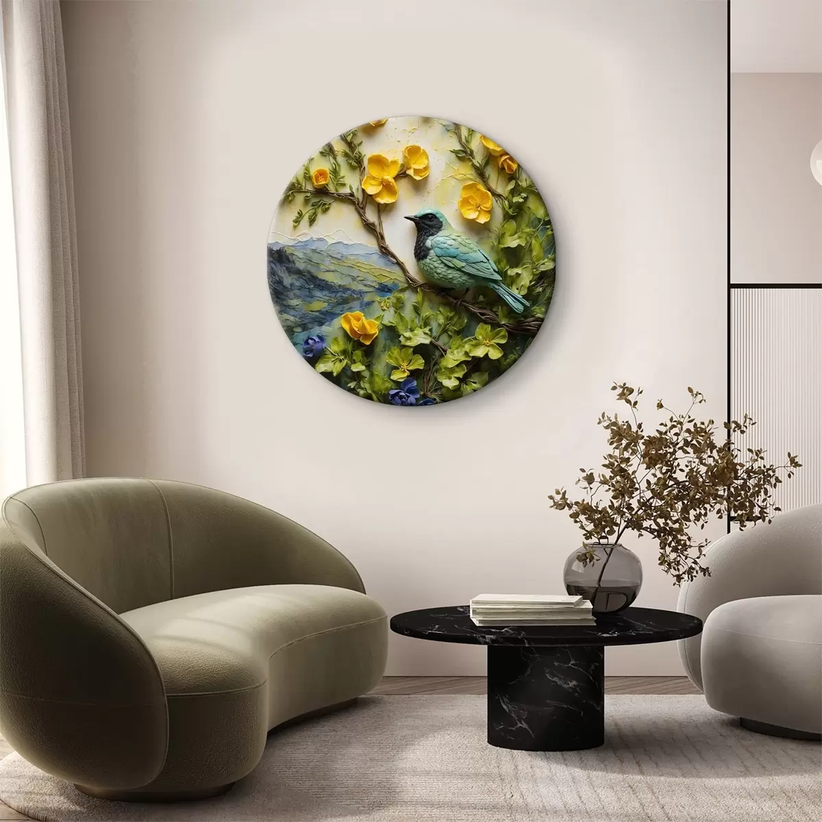 Кругла картина Птах на гілці дерева в оточенні квітів Nr r38431