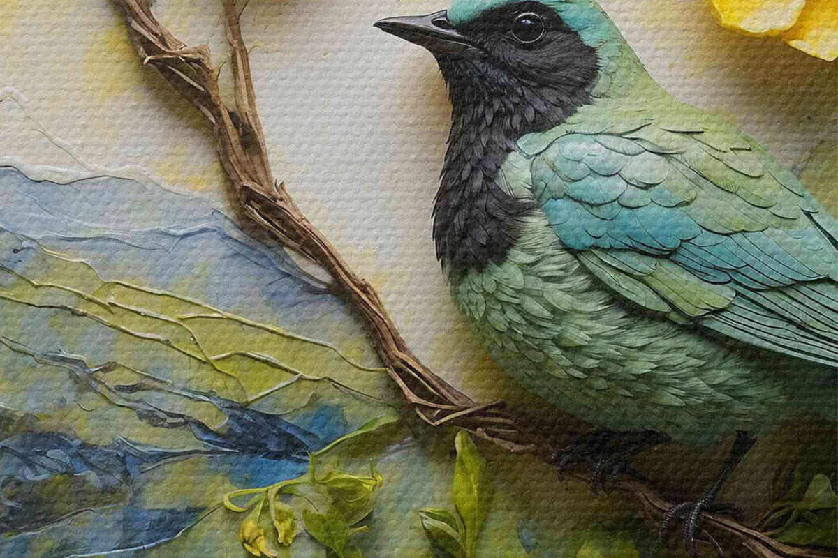 Кругла картина Птах на гілці дерева в оточенні квітів r38431