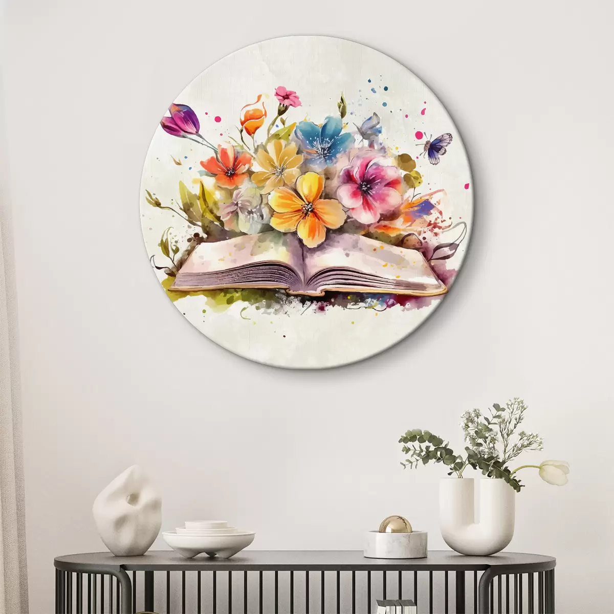 Кругла картина відкрита книга з квітами, акварельні фарби r38446