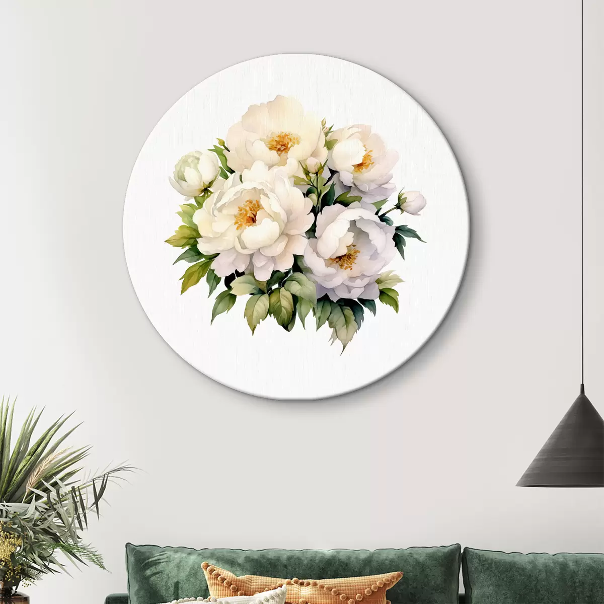 Кругла картина Білий квітучий півонія квіти в зелене листя, акварель, ботанічні Nr r38481
