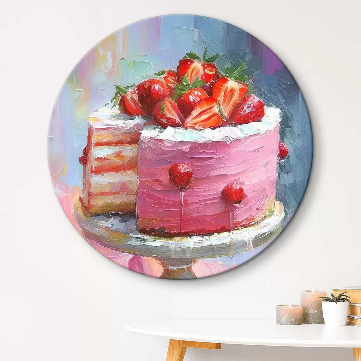Кругла картина Полуничний торт з кремом, олійною фарбою, великими мазками, літні ягоди, рожеві кольори r38499